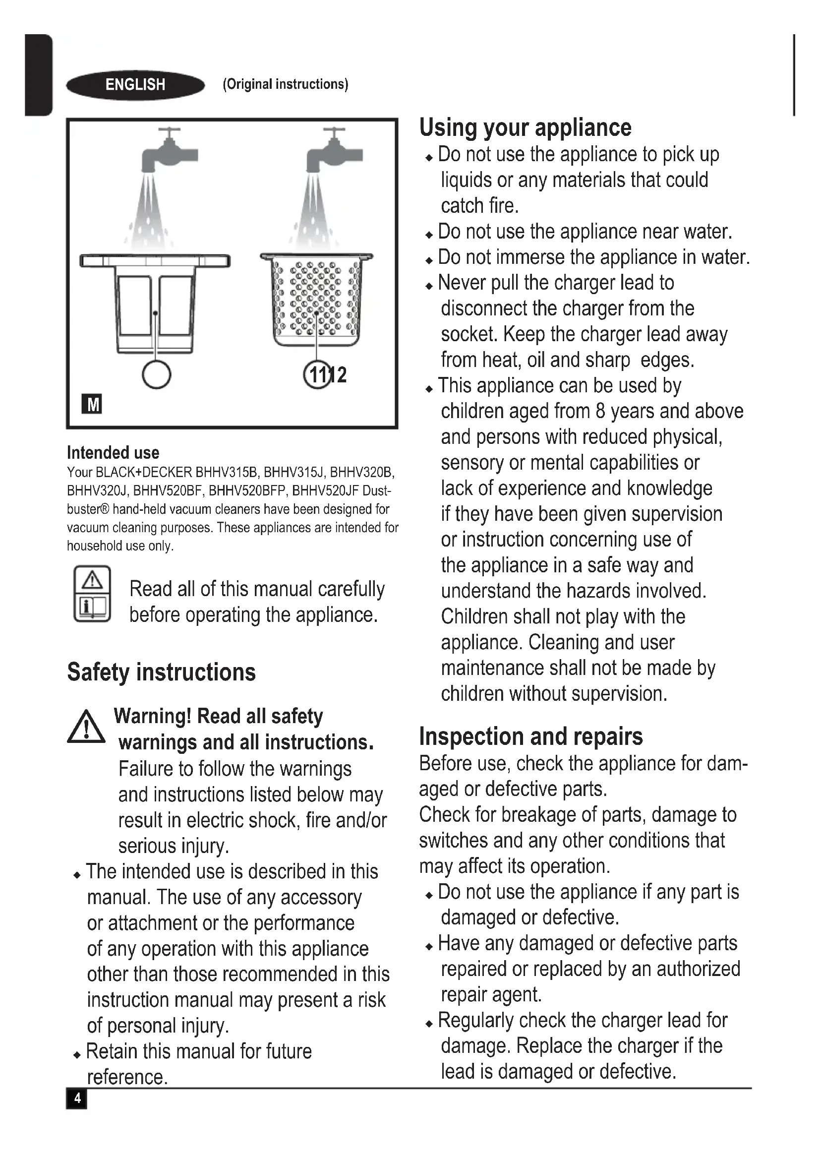 6e4 ENGLISH(Original instructions) Intended use Your BLACK+DECKER BHHV315B, BHHV315J, BHHV320B,BHHV320J, BHHV520BF, BHHV520BFP, BHHV520JF Dust-buster® hand-held vacuum cleaners have been designed for vacuum cleaning purposes. These appliances are intended for household use only. Read all of this manual carefully before operating the appliance. Safety instructions