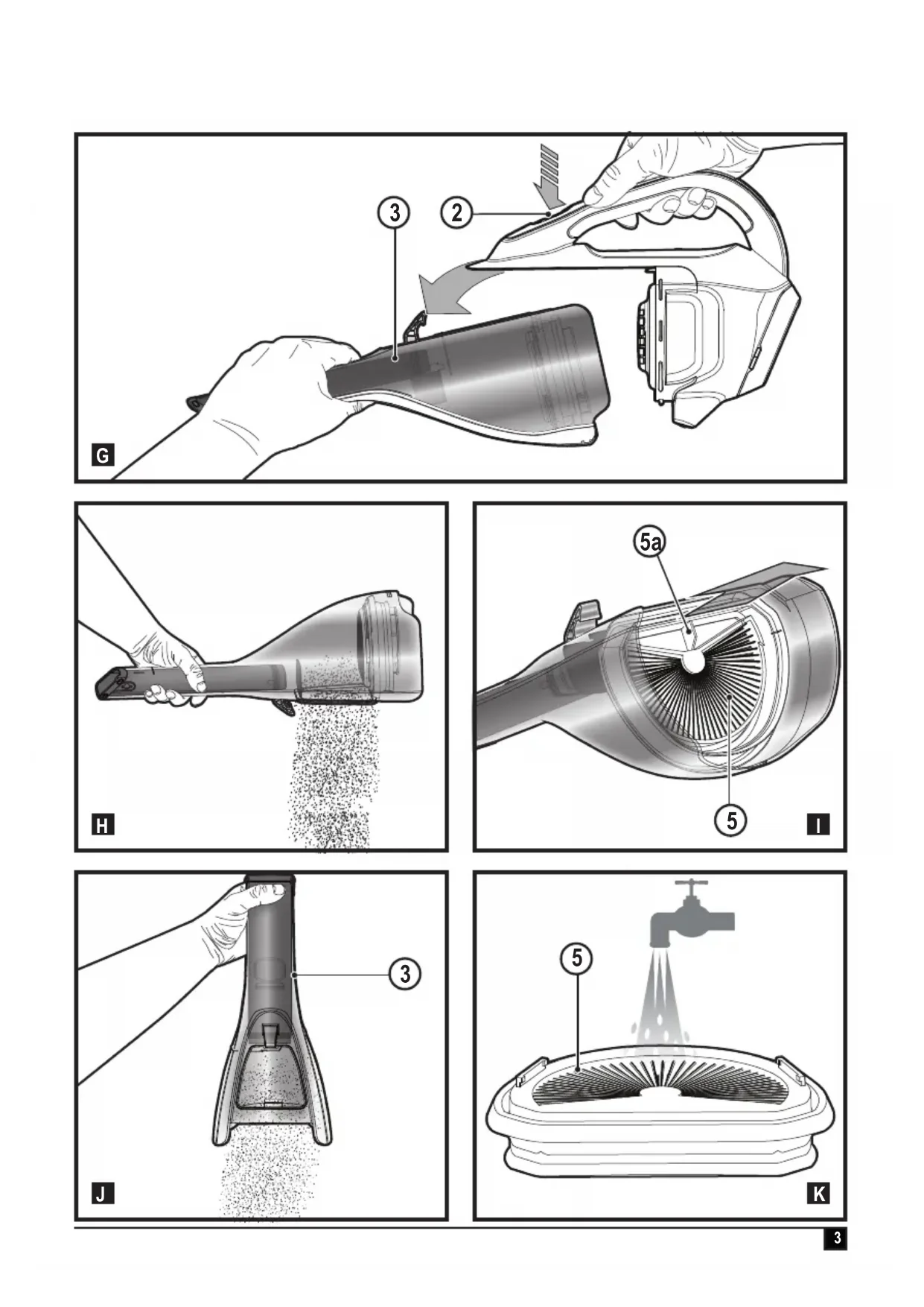 Use Charging (Fig. A, B) Warning! For use only with the supplied charger. From new, the rechargeable cells of the product need a mini- mum charge time of 16 hours to ensure full power. u Place the charging terminal (8) into the charging port (9) on the handle of the unit as shown in gure A. u Place the wall charger (7) into a power outlet and switch on as shown in gure B. Note: The On/off power switch (1) must be in the (“O”) posi- tion, the product will not charge if it is in any other position. u While charging, the charger may get warm, this is perfectly normal and safe. It is safe to leave the appliance connect- ed to the charger indenitely. The charger automatically reduces power consumption when charging is complete. Warning! Do not charge the battery at ambient temperatures below 4°C or above 40°C. Use Switching on and off (Fig. D) u To start, slide the On/Off switch ( 1 ) forward (i.e. “O”= Off, “I” = On) in Figure C. u To stop, slide the switch back. Using the pull out crevice tool (Fig. C) u Extend the crevice tool (4) as shown in gure D, until it clicks in place. Attaching the pet head (Fig. E) Warning! The unit needs to be switched off when the pet head is attached or detached. Warning! Do not use directly on pets. u Slide the dust bowl opening (3) into the opening of the motorized pet head (6), ensuring that the connectors (6b) engage with the recesses (3b). An audible click will be heard. Removing the pet head (Fig. F) u Pull the motorized pet head release tabs (6a) outward to release them from the recesses (3a). u Pull the main unit from the pet head. Warning! The unit needs to be switched off when the pet head is attached or detached. Cleaning the lters (Fig. G, H, I, J, K) u Press the dust chamber release button (2) as shown in gure G. u Seperate the dust chamber (3) from the motor unit as shown in gure G. u You can use the easy empty feature as shown in gure H. u Lift the filter (5) out of the dust chamber (3) using the tab (5a) provided shown in gure I. u Empty the dust bowl (3) by lightly shaking over a suitable container as shown in gure J. u Rinse out the dust-bowl with warm soapy water. u Wash the lters with warm soapy water as shown in gure