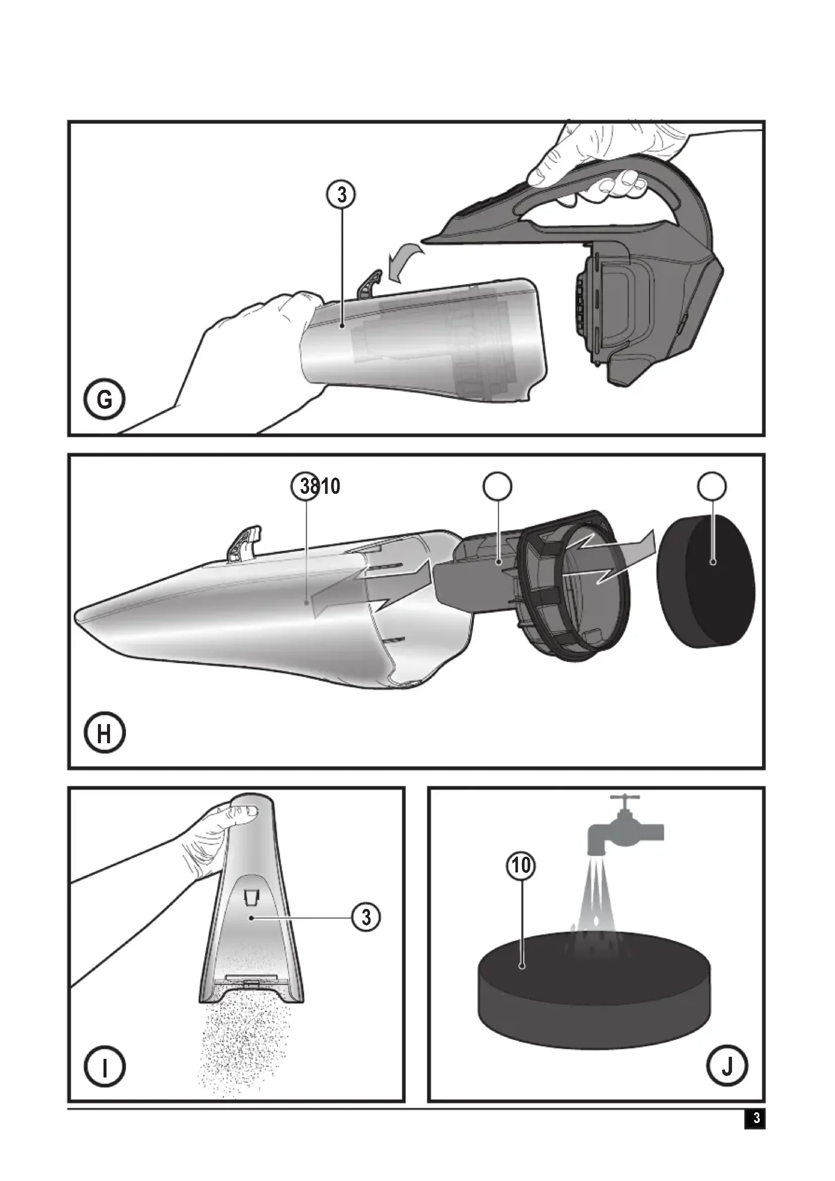 Warning! Read all safety warnings and all instructions. Failure to follow the warnings and instructions listed below may result in electric shock, re and/or serious injury. u The intended use is described in this manual. The use of any accessory or attachment or the performance of any operation with this appliance other than those recommended in this instruction manual may present a risk of personal injury. u Retain this manual for future reference. Using your appliance u Do not use the appliance to pick up liquids or any materials that could catch re. u Do not immerse the appliance in water.u Never pull the charger lead to disconnect the charger from the socket. Keep the charger lead away from heat, oil and sharp edges. u This appliance can be used by children aged from 8 years and above and persons with reduced physical, sensory or mental capabilities or lack of experience and knowledge if they have been given supervision or instruction concerning use of the appliance in a safe way and understand the hazards involved. Children shall not play with the appliance. Cleaning and user maintenance shall not be made by children without supervision. Inspection and repairs Before use, check the appliance for dam- aged or defective parts. Check for breakage of parts, damage to switches and any other conditions that may affect its operation. u Do not use the appliance if any part is damaged or defective. u Have any damaged or defective parts repaired or replaced by an authorized repair agent. u Regularly check the charger lead for damage. Replace the charger if the lead is damaged or defective. u Never attempt to remove or replace any parts other than those specied in this manual. Additional safety instructions After use u Unplug the charger before cleaning.u When not in use, the appliance should be stored in a dry place. u Children should not have access to stored appliances.5 ENGLISH(Original instructions) Residual risks Additional residual risks may arise when using the tool which may not be included in the enclosed safety warnings. These risks can arise from misuse, prolonged use etc. Even with the application of the relevant safety regulations and the implementa- tion of safety devices, certain residual risks can not be avoided. These include: u Injuries caused by touching any rotating/moving parts. u Injuries caused when changing any parts, blades or accessories. u Injuries caused by prolonged use of a tool. When using any tool for prolonged periods ensure you take regular breaks. u Impairment of hearing.u Health hazards caused by breathing dust developed when using your tool (example:- working with wood, especially oak, beech and MDF.) Chargers Your charger has been designed for a specic voltage. Always check that the mains voltage corresponds to the voltage on the rating plate. Warning! Never attempt to replace the charger unit with a regular mains plug. u Use your BLACK+DECKER charger only to charge the battery in the appliance with which it was supplied. Other batteries could burst, causing personal injury and damage. u Never attempt to charge non- rechargeable batteries. u If the supply cord is damaged, it must be replaced by the manufacturer or an authorised BLACK+DECKER Service Centre in order to avoid a hazard. u Do not expose the charger to water.u Do not open the charger.u Do not probe the charger.u The appliance/battery must be placed in a well ventilated area when charging. Electrical safety Symbols on the charger Read all of this manual carefully before using the appliance. This tool is double insulated; therefore no earth wire is required. Always check that the power supply corresponds to the voltage on the rating plate. The charger is intended for indoor use only.Labels on applianceThe following symbols appear on this appliance along with the date code. Read all of this manual carefully before using the applianceS003AQ-15Only use with charger S003AQ-15FeaturesThis tool includes some or all of the following features. 1. On/off power switch 2. Dust chamber release button 3. Dust chamber 4. Wall bracket 5. Charger 6. Hanging attatchment 7. Removable squeegee6 ENGLISH (Original instructions) Use Switching on and off (Fig. A) u Push the On/off power switch (1) to the forward position to turn on the unit. u Returning the On/off power (1) switch will turn the unit off. Fitting the removable squeegee (Fig. B) u Insert the removable squeegee into the front of the appliance. Make sure that the accessory is pushed fully in as shown gure B. Fitting the wall bracket (Fig. C) u Fit the wall bracket (4) to a suitable wall (preferably near a power outlet) using the screws provided. u The unit can then be stored, when not in use, or during the charging procedure, utilising the hanging attachment (6). Charging (Fig. D, E) u Place the charger (5) into the charging port (9) on the handle of the unit as shown in gure D. u Place the charging plug into a power outlet and switch on as shown in gure E. The charger LED (9) will light. Cleaning the lters (Fig. F, G, H, I, J) u Press the dust chamber release button (2) as shown in gure F. u Seperate the dust chamber (3) from the motor unit as shown in gure G. u Lift the pre filter assembly (8) out of the dust chamber (3). Remove the wet/dry foam lter (10) from the lter assem- bly as shown in gure H. u Empty the dust bowl (3) by lightly shaking over a suitable container as shown in gure I. u Rinse out the dust-bowl with warm soapy water.u Wash the lter with warm soapy water as shown in gure u Allow the lter to dry naturally, using heat may cause the lters to distort. u Ret the lter (10) into dust chamber (3). u Replace the dust chamber onto the motor unit. Make sure the release button (2) clicks into place. Warning! Before performing any maintenance or cleaning on the appliance, unplug the appliance. From time to time wipe the appliance with a damp cloth. Do not use any abrasive or solvent-based cleaner. Do not immerse the appliance in water. Maintenance 