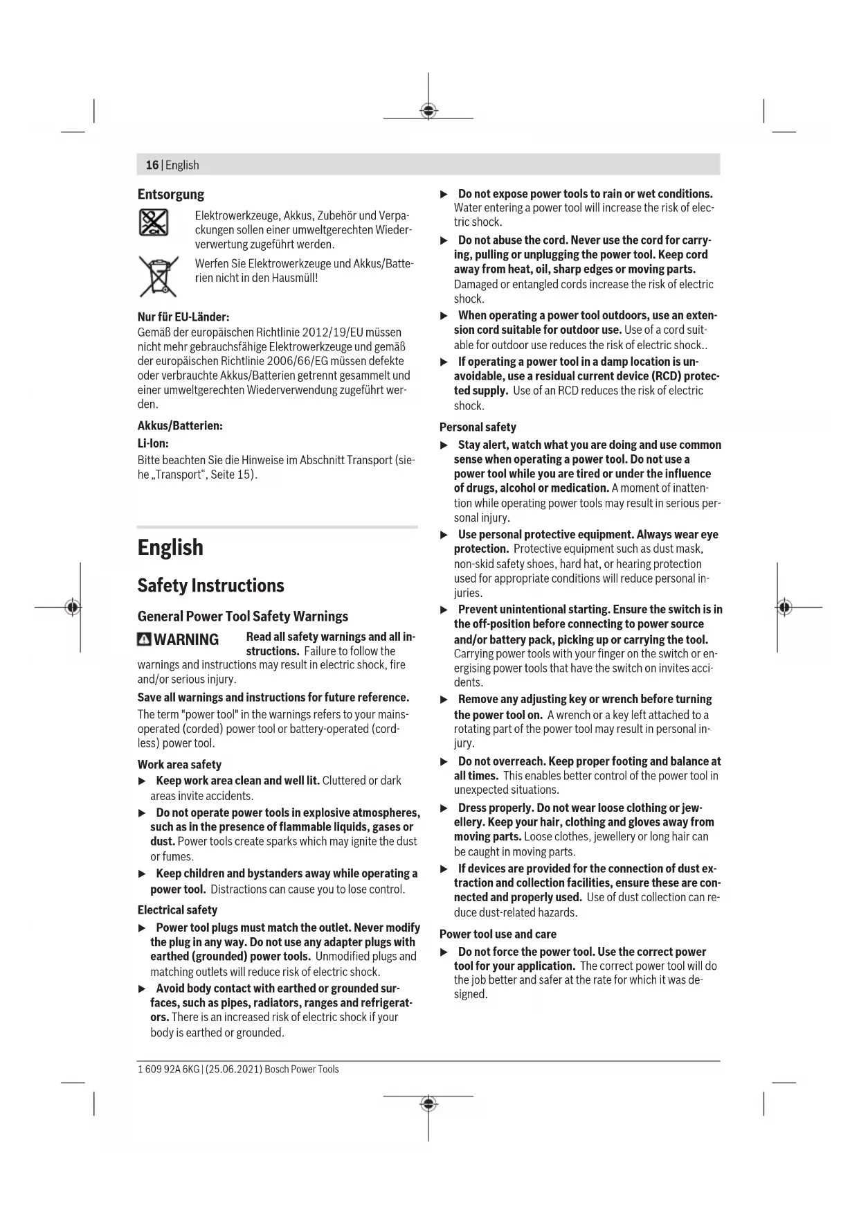 The vibration level given in these instructions has been measured in accordance with a standardised measuring pro- cedure and may be used to compare power tools. It can also be used for a preliminary estimation of exposure to vibra- tion. The stated vibration level applies to the main applications of the power tool. However, if the power tool is used for differ- ent applications, with different application tools or poorly maintained, the vibration level may differ. This can signific- antly increase the exposure to vibration over the total work- ing period. To estimate the exposure to vibration accurately, the times when the tool is switched off or when it is running but not ac- tually being used should also be taken into account. This can significantly reduce the exposure to vibration over the total working period. Implement additional safety measures to protect the oper- ator from the effects of vibration, such as servicing the power tool and application tools, keeping the hands warm, and organising workflows correctly. Fitting Charging the battery u Use only the chargers listed in the technical data. Only these chargers are matched to the lithium-ion battery of your power tool. 1 609 92A 6KG | (25.06.2021) Bosch Power ToolsEnglish | 21 Note: The battery is supplied partially charged. To ensure full battery capacity, fully charge the battery in the charger before using your power tool for the first time. The lithium-ion battery can be charged at any time without reducing its service life. Interrupting the charging process does not damage the battery. The lithium-ion battery is protected against deep discharge by the "Electronic Cell Protection (ECP)". When the battery is discharged, the power tool is switched off by means of a protective circuit: The application tool no longer rotates. u Do not continue to press the On/Off switch after the power tool has automatically switched off. The battery can be damaged. Follow the instructions on correct disposal. Removing the Battery The battery (5) is equipped with two locking levels to pre- vent the battery from falling out if the battery release button (6) is pressed unintentionally. As long as the battery is inser- ted in the power tool, it is held in position by means of a spring. To remove the battery (5), press the release button (6) and pull the battery out of the power tool. Do not use force to do this. Battery charge indicator The green LEDs on the battery charge indicator indicate the state of charge of the battery. For safety reasons, it is only possible to check the state of charge when the power tool is not in operation. Press the button for the battery charge indicator or to show the state of charge. This is also possible when the bat- tery is removed. If no LED lights up after pressing the button for the battery charge indicator, then the battery is defective and must be replaced. Battery model GBA 18V... LEDs Capacity 3× continuous green light 60−100% 2× continuous green light 30−60% 1× continuous green light 5−30% 1× flashing green light 0−5% Battery model ProCORE18V... LEDs Capacity 5× continuous green light 80−100% 4× continuous green light 60−80% LEDs Capacity 3× continuous green light 40−60% 2× continuous green light 20−40% 1× continuous green light 5−20% 1× flashing green light 0−5% Fitting Protective Equipment u Remove the battery from the power tool before carry- ing out work on the power tool (e.g. maintenance, changing tool, etc.). The battery should also be re- moved for transport and storage. There is risk of injury from unintentionally pressing the on/off switch. Note: If the grinding disc breaks during operation or the holding fixtures on the protective guard/power tool become damaged, the power tool must be sent to the after-sales ser- vice immediately; see the "After-Sales Service and Applica- tion Service" section for addresses. Protective guard for grinding Place the protective guard (8) onto the holder on the power tool until the coding cams of the protective guard are aligned with the holder. When doing so, press and hold the unlocking lever (1). Press the protective guard (8) onto the spindle collar un- til the shoulder of the pro- tective guard is sitting on the flange of the power tool and rotate the protective guard until it audibly clicks into place. Adjust the position of the protective guard (8) to meet the requirements of the operation. To do this, push the unlock- ing lever (1) upward and rotate the protective guard (8) into the required position. u Always position the protective guard(8) such that the two cams on the unlocking lever(1) engage in the corresponding openings on the protective guard(8). u Adjust the protective guard (8) such that sparking in the direction of the operator is prevented. u The protective guard (8) must only be adjustable while the unlocking lever (1) is actuated. Otherwise, the power tool must not be used any more under any circumstances and must be sent to the after-sales ser- vice. Note: The coding cams on the protective guard (8) ensure that only a protective guard that is suitable for the power tool can be fitted. Protective guard for cutting u Always use the protective guard for cutting (12) when cutting with bonded abrasives. u Provide sufficient dust extraction when cutting stone. Bosch Power Tools 1 609 92A 6KG | (25.06.2021)22 | English The protective guard for cutting (12) is fitted in the same way as the protective guard for grinding (8). Extraction guard for cutting with a guide block The extraction guard for cutting with a guide block (22) is fit- ted in the same way as the protective guard for grinding (8). Side handle u Do not operate your power tool without the side handle (7). Screw the side handle (7) on the left or right of the machine head depending on how your are working. Low-vibration auxiliary handle The low-vibration auxiliary handle reduces vibration, enabling the tool to be used safely and more comfort- ably. u Do not