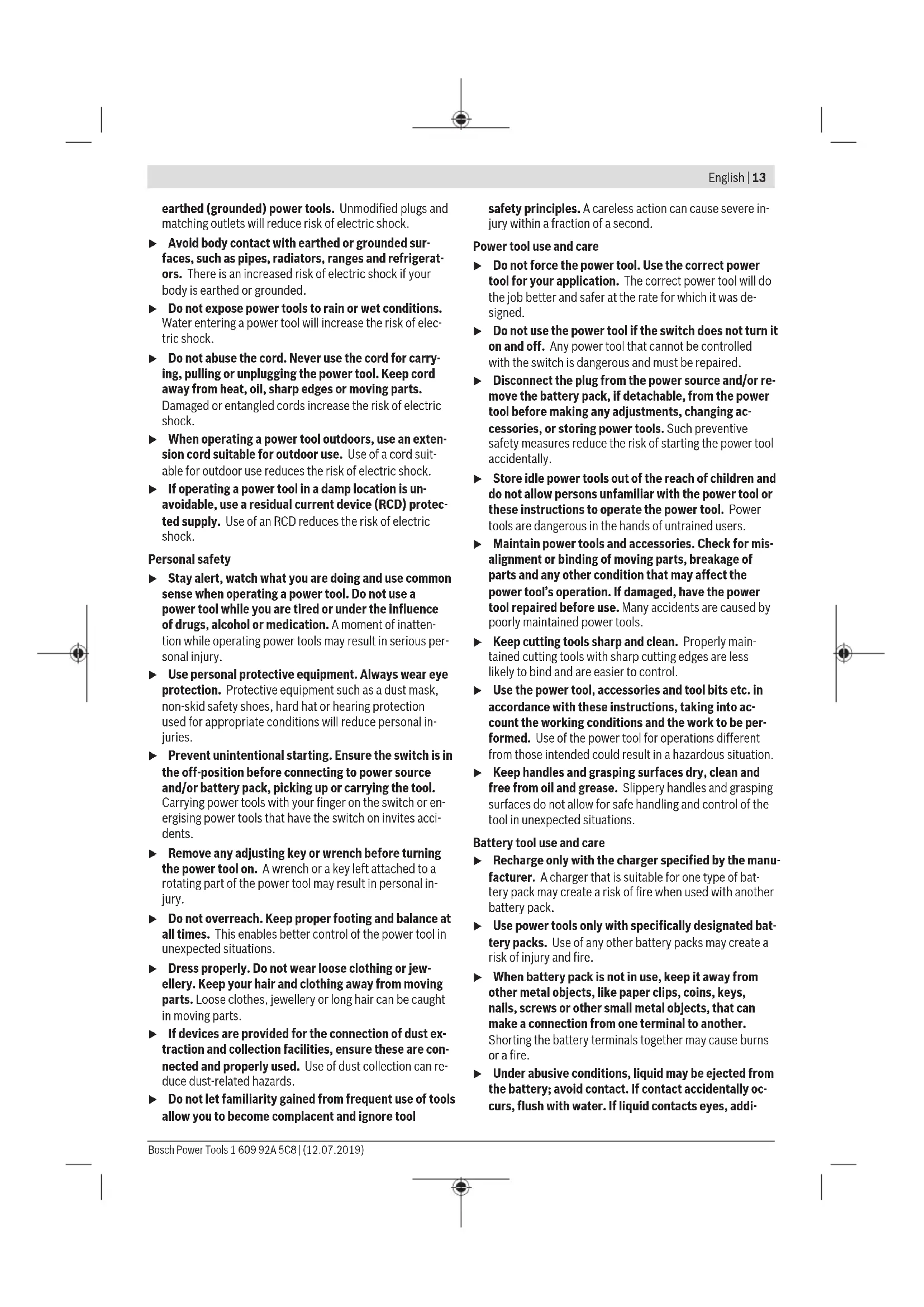 The vibration level and noise emission value given in these instructions have been measured in accordance with a standardised measuring procedure and may be used to com- pare power tools. They may also be used for a preliminary estimation of vibration and noise emissions. The stated vibration level and noise emission value repres- ent the main applications of the power tool. However, if the power tool is used for other applications, with different ap- plication tools or is poorly maintained, the vibration level and noise emission value may differ. This may significantly increase the vibration and noise emissions over the total working period. To estimate vibration and noise emissions accurately, the times when the tool is switched off or when it is running but not actually being used should also be taken into account. This may significantly reduce vibration and noise emissions over the total working period. Implement additional safety measures to protect the oper- ator from the effects of vibration, such as servicing the power tool and application tools, keeping their hands warm, and organising workflows correctly. Assembly u Remove the battery from the power tool before carry- ing out work on the power tool (e.g. maintenance, changing tool, etc.). The battery should also be re- moved for transport and storage. There is risk of injury from unintentionally pressing the on/off switch. Bosch Power Tools 1 609 92A 5PX | (16.03.2020)16 | English Battery Charging u Use only the chargers listed in the technical data. Only these chargers are matched to the lithium-ion battery of your power tool. Note: The battery is supplied partially charged. To ensure full battery capacity, fully charge the battery in the charger before using your power tool for the first time. The lithium-ion battery can be charged at any time without reducing its service life. Interrupting the charging process does not damage the battery. The lithium-ion battery is protected against deep discharge by the "Electronic Cell Protection (ECP)". When the battery is discharged, the power tool is switched off by means of a protective circuit: The application tool no longer rotates. u Do not continue to press the On/Off switch after the power tool has automatically switched off. The battery can be damaged. Observe the notes for disposal. Removing the Battery The battery (6) is equipped with two locking levels to pre- vent the battery from falling out when pushing the battery re- lease button (7) unintentionally. As long as the battery is in- serted in the power tool, it is held in position by means of a spring. To remove the battery (6), press the release button (7) and pull the battery out of the power tool. Do not use force to do this. Battery charge indicator The green LEDs on the battery charge indicator indicate the state of charge of the battery. For safety reasons, it is only possible to check the state of charge when the power tool is not in operation. Press the button for the battery charge indicator or to show the state of charge. This is also possible when the bat- tery is removed. If no LED lights up after pressing the button for the battery charge indicator, then the battery is defective and must be replaced. Note: The state of charge of the battery is also displayed on the user interface. Note: The state of charge of the battery is also displayed on the user interface Status indications. Battery model GBA 18V... LEDs Capacity 3× continuous green light 60−100% 2× continuous green light 30−60% 1× continuous green light 5−30% 1× flashing green light 0−5% Battery model ProCORE18V... LEDs Capacity 5× continuous green light 80−100% 4× continuous green light 60−80% 3× continuous green light 40−60% 2× continuous green light 20−40% 1× continuous green light 5−20% 1× flashing green light 0−5% Changing the Tool u Remove the battery from the power tool before carry- ing out work on the power tool (e.g. maintenance, changing tool, etc.). The battery should also be re- moved for transport and storage. There is risk of injury from unintentionally pressing the on/off switch. u Regularly clean the power tool’s air vents. The motor’s fan can draw the dust inside the housing and excessive accumulation of powdered metal may cause electrical hazards. Use application tool: GDR/GDX 18 V-200 C (see figure A–B) Pull the locking sleeve (2) forward, guide the application tool (1) into the tool holder up to the stop and release the locking sleeve (2) to lock the application tool. Impact-proof screwdriver bits (17) can be inserted using a universal bit holder with ball catch (16). Impact-proof screwdriver bits (17) can be inserted using a universal bit holder with ball catch (16). Use application tool: GDX/GDS 18 V-200 C (see figure B–C) u When working with an application tool, pay attention that the application tool is connected securely to the tool holder. When the application tool is not securely connected with the tool holder, it can come off during ap- plication. Slide the application tool (18) onto the square drive of the tool holder (1). Due to the way the system operates, the application tool (18) will move around slightly in the tool holder (1); this has no influence on the function/safety. Some application tools (e.g. double bits) cannot be safely secured in the tool holder. Removing Pull the locking sleeve (2) forward and remove the applica- tion tool. 1 609 92A 5PX | (16.03.2020) Bosch Power ToolsEnglish | 17 Operation Method of Operation The tool holder (1) (with the application tool) is driven by an electric motor via a gear and impact mechanism. The working procedure is divided into two phases: Screwing in and tightening (impact mechanism in action). The impact mechanism is activated as soon as the screwed connection runs tight and load is therefore put on the motor. The impact mechanism then converts the power of the mo- tor to steady rotary impacts. When loosening screws or nuts, the process is