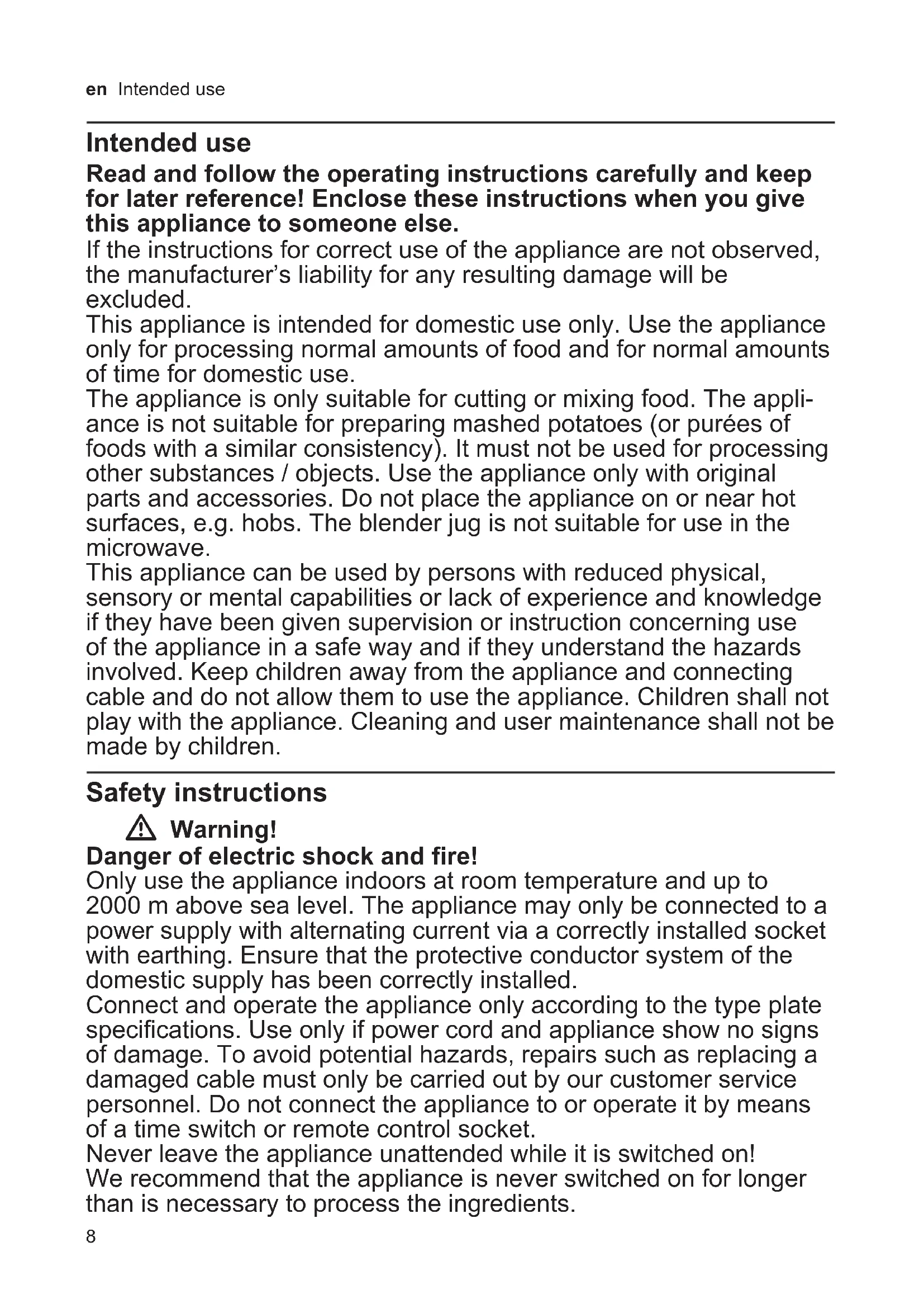 gungen jederzeit über Ihren Fachhändler, bei dem Sie das Gerät gekauft haben, oder direkt bei unserer Landesvertretung anfordern. Die Garantie bedingungen für Deutschland und die Adressen nden Sie auf den letzten vier Seiten dieses Heftes. Darüber hinaus sind die Garantie- bedingungen auch im Internet unter der benannten Webadresse hinterlegt. Für die Inanspruchnahme von Garantie- leistungen ist in jedem Fall die Vorlage des Kauf beleges erforderlich. Änderungen vorbehalten.8 en Intended use Intended use Read and follow the operating instructions carefully and keep for later reference! Enclose these instructions when you give this appliance to someone else. If the instructions for correct use of the appliance are not observed, the manufacturer’s liability for any resulting damage will be excluded. This appliance is intended for domestic use only. Use the appliance only for processing normal amounts of food and for normal amounts of time for domestic use. The appliance is only suitable for cutting or mixing food. The appli- ance is not suitable for preparing mashed potatoes (or purées of foods with a similar consistency). It must not be used for processing other substances / objects. Use the appliance only with original parts and accessories. Do not place the appliance on or near hot surfaces, e.g. hobs. The blender jug is not suitable for use in the microwave. This appliance can be used by persons with reduced physical, sensory or mental capabilities or lack of experience and knowledge if they have been given supervision or instruction concerning use of the appliance in a safe way and if they understand the hazards involved. Keep children away from the appliance and connecting cable and do not allow them to use the appliance. Children shall not play with the appliance. Cleaning and user maintenance shall not be made by children. Safety instructions W Warning! Danger of electric shock and fire! Only use the appliance indoors at room temperature and up to 2000 m above sea level. The appliance may only be connected to a power supply with alternating current via a correctly installed socket with earthing. Ensure that the protective conductor system of the domestic supply has been correctly installed. Connect and operate the appliance only according to the type plate specifications. Use only if power cord and appliance show no signs of damage. To avoid potential hazards, repairs such as replacing a damaged cable must only be carried out by our customer service personnel. Do not connect the appliance to or operate it by means of a time switch or remote control socket. Never leave the appliance unattended while it is switched on! We recommend that the appliance is never switched on for longer than is necessary to process the ingredients.9
