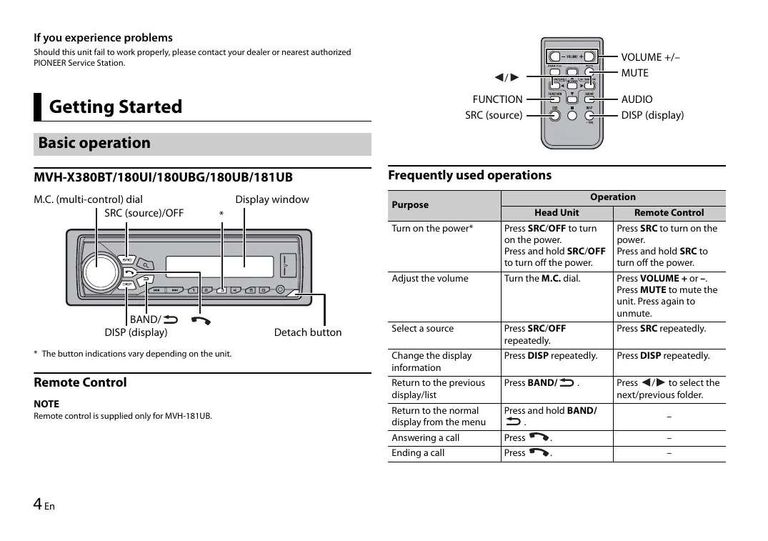 English If you experience problems Should this unit fail to work properly, please contact your dealer or nearest authorized PIONEER Service Station. VOLUME +/– MUTE