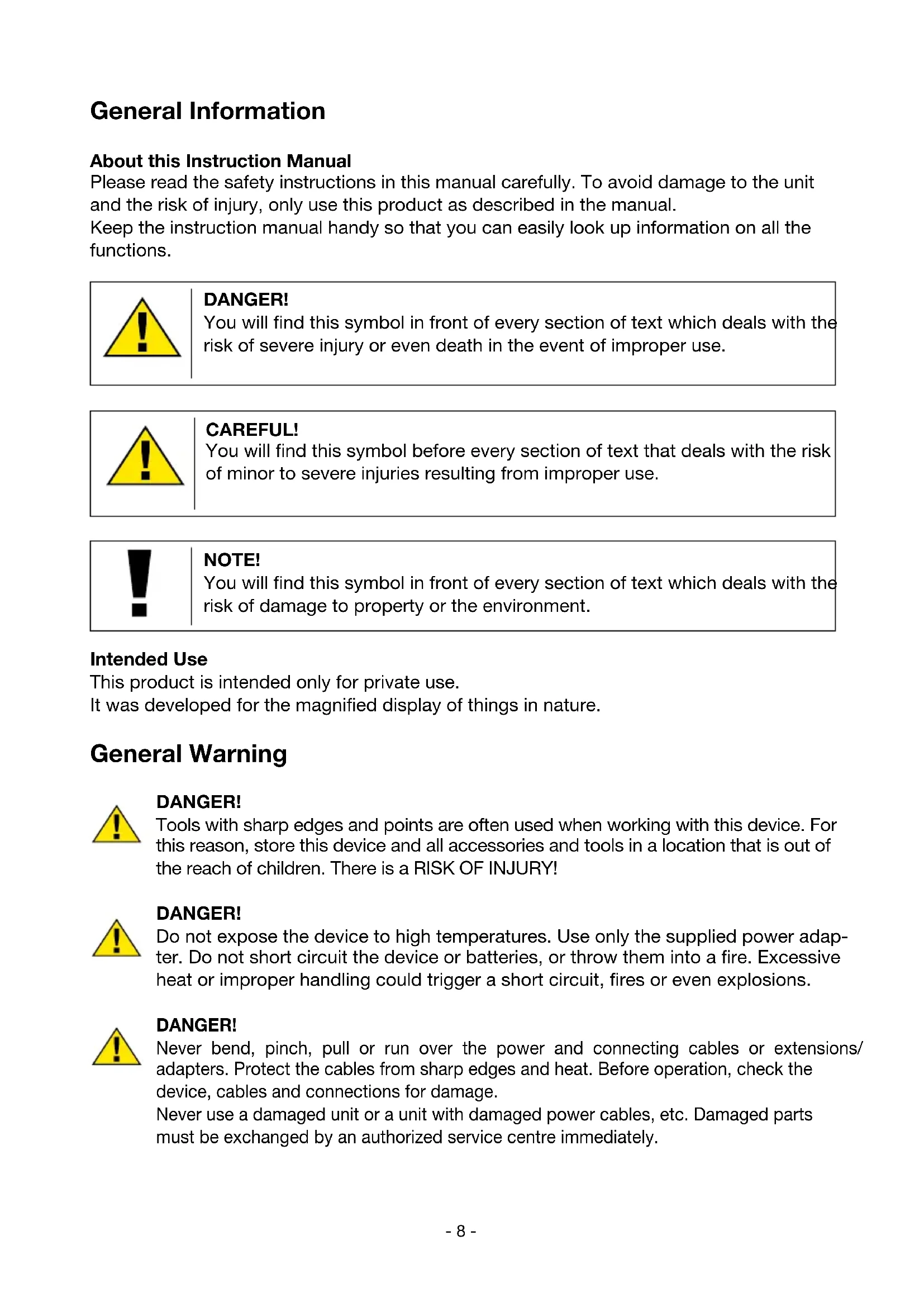 FRGeneral Information About this Instruction Manual Please read the safety instructions in this manual carefully. To avoid damage to the unit and the risk of injury, only use this product as described in the manual. Keep the instruction manual handy so that you can easily look up information on all the functions. DANGER! You will find this symbol in front of every section of text which deals with the risk of severe injury or even death in the event of improper use. CAREFUL! You will find this symbol before every section of text that deals with the risk of minor to severe injuries resulting from improper use. NOTE! You will find this symbol in front of every section of text which deals with the risk of damage to property or the environment. Intended Use This product is intended only for private use. It was developed for the magnified display of things in nature. General Warning DANGER! Tools with sharp edges and points are often used when working with this device. For this reason, store this device and all accessories and tools in a location that is out of the reach of children. There is a RISK OF INJURY! DANGER! Do not expose the device to high temperatures. Use only the supplied power adap- ter. Do not short circuit the device or batteries, or throw them into a fire. Excessive heat or improper handling could trigger a short circuit, fires or even explosions. DANGER! Never bend, pinch, pull or run over the power and connecting cables or extensions/ adapters. Protect the cables from sharp edges and heat. Before operation, check the device, cables and connections for damage. Never use a damaged unit or a unit with damaged power cables, etc. Damaged parts must be exchanged by an authorized service centre immediately. - 8 -DANGER! Children should only use the device under adult supervision. Keep packaging ma- terial (plastic bags, rubber bands, etc.) out of the reach of children! There is a RISK OF CHOKING! Children must not have access to the included chemicals and liquids. Do not drink the chemicals. Wash hands thoroughly with running water after use. In the event of contact with the eyes or mouth, rinse thoroughly with water. In the event of pain, contact a doctor immediately and take the substances with you. DANGER! Children should only use the device under adult supervision. Keep packaging ma- terial (plastic bags, rubber bands, etc.) out of the reach of children! There is a RISK OF CHOKING! CAREFUL! Children must not have access to the included chemicals and liquids. Do not drink the chemicals. Wash hands thoroughly with running water after use. In the event of contact with the eyes or mouth, rinse thoroughly with water. In the event of pain, contact a doctor immediately and take the substances with you. NOTE! Do not disassemble the device. In the event of a defect, please contact your dealer. He will contact the Service Centre and can send the device in to be repaired, if necessary. Do not expose the device to temperatures above 40°C. Positionyourdevicesothatitcanbedisconnectedfromthepowersupplyatanytime. Thewallsocketshouldalwaysbelocatednearthedeviceandbeeasilyaccessible,since theplugonthepowercordservesasadisconnectingdeviceforthepowersupply. Allparts: BEyepieces CDiopteradjustmentring DBinocularviewing EObjective FObjectiveclampingscrew GFocussingwheel HIllumination IGuidanceofmicroscopehead JPowerswitch 1)Microscopestagewithobjectplate(black/white) 1!Objectclips 1@Fuseholder(withfuse) 1#Powercord 1$Fasteningscrewforguardcover 1%Guardcover