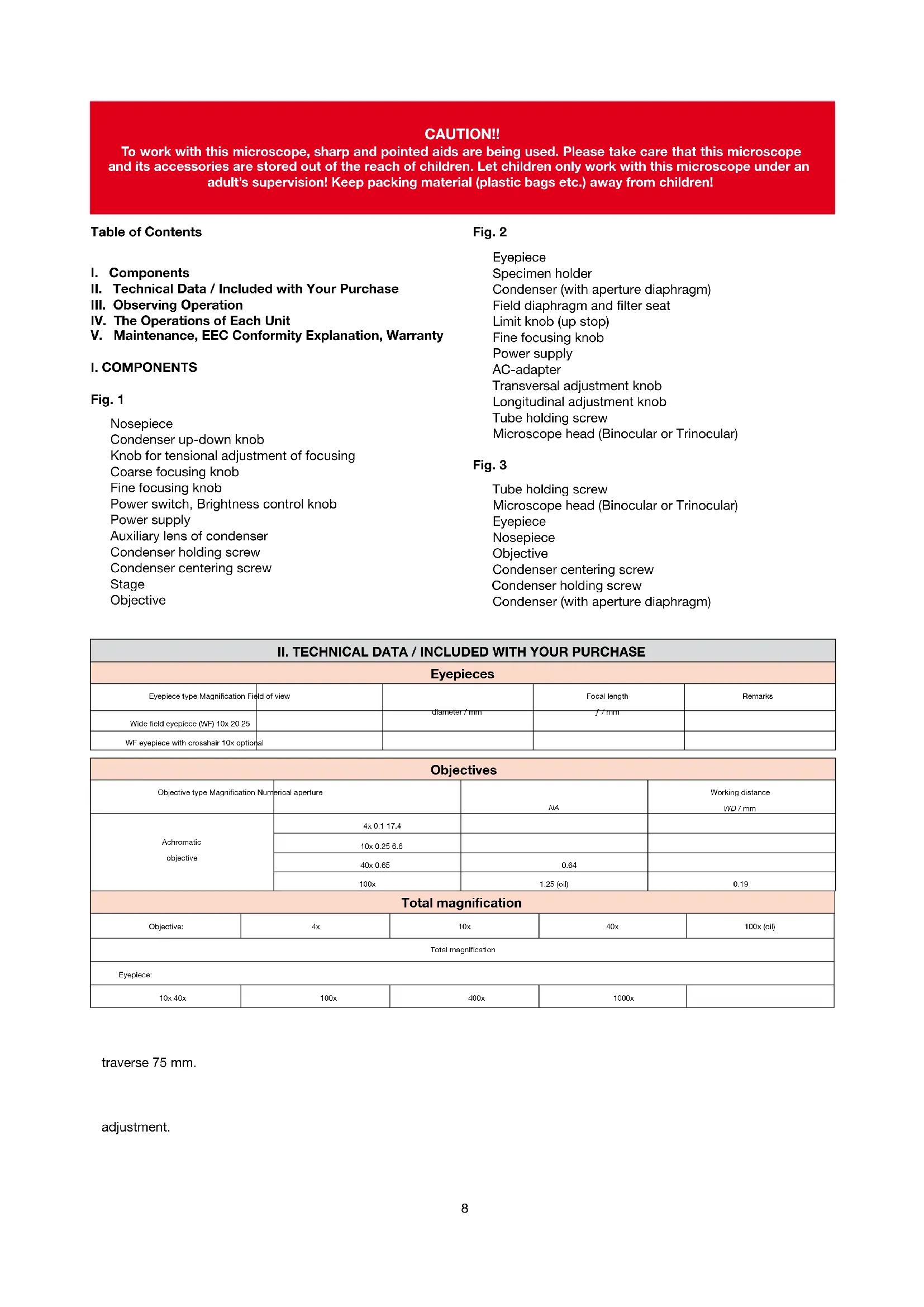 CAUTION!! To work with this microscope, sharp and pointed aids are being used. Please take care that this microscope and its accessories are stored out of the reach of children. Let children only work with this microscope under an adult’s supervision! Keep packing material (plastic bags etc.) away from children! Objective: 4x 10x 40x 100x (oil) Total magnification Eyepiece: 10x 40x 100x 400x 1000x Total magnification9