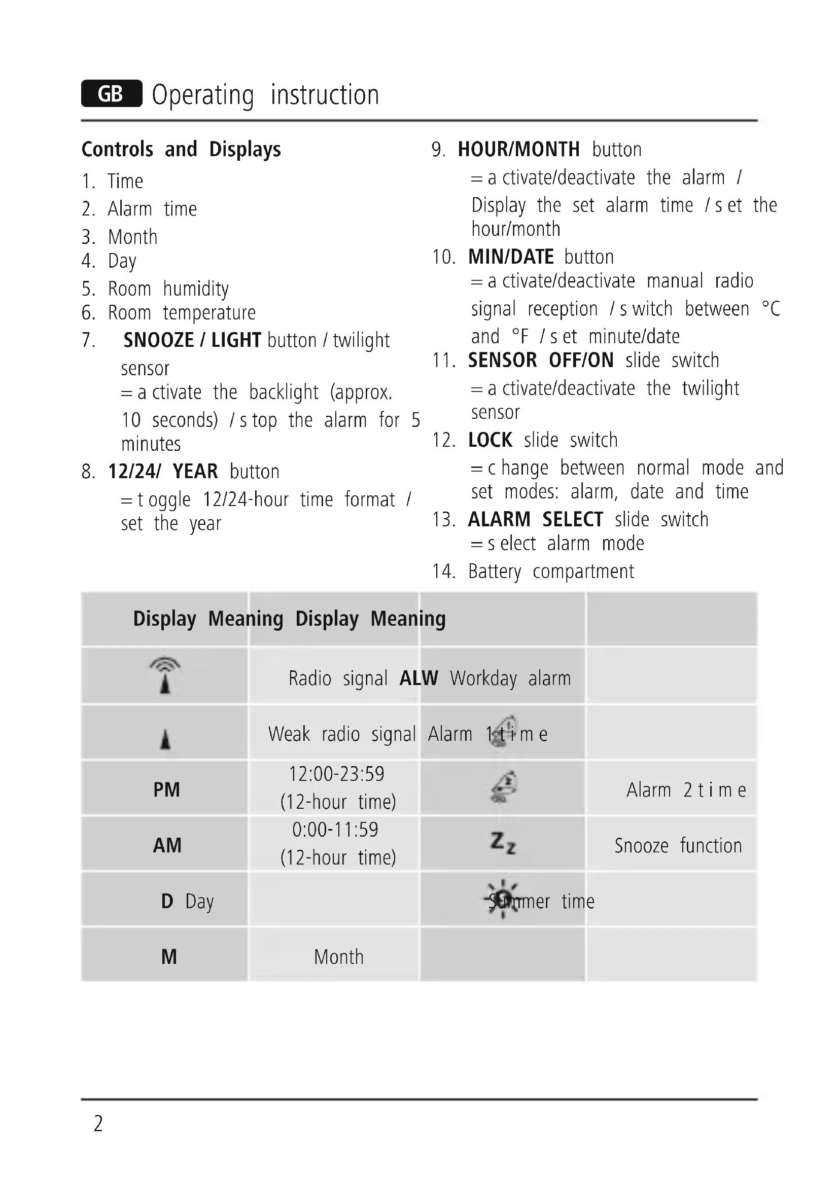- Repeatedly press the HOUR/MONTH button (9) to display the set time of alarm 1(2) or alarm 2(2).