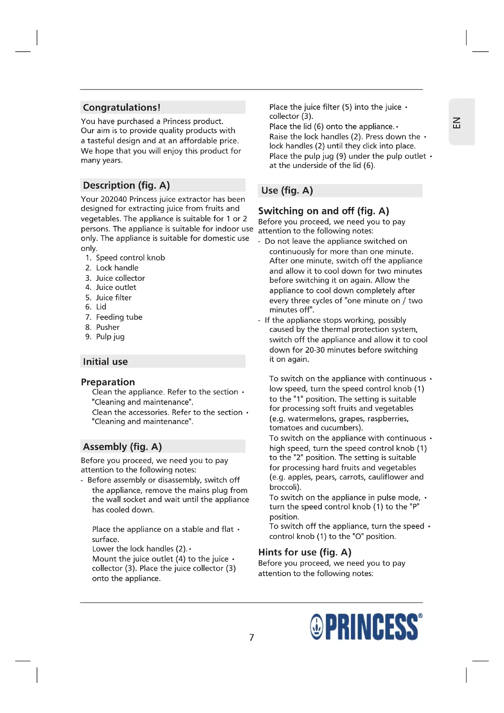 Congratulations! You have purchased a Princess product. Our aim is to provide quality products with a tasteful design and at an affordable price. We hope that you will enjoy this product for many years. Description (fig. A) Your 202040 Princess juice extractor has been designed for extracting juice from fruits and vegetables. The appliance is suitable for 1 or 2 persons. The appliance is suitable for indoor use only. The appliance is suitable for domestic use only.
