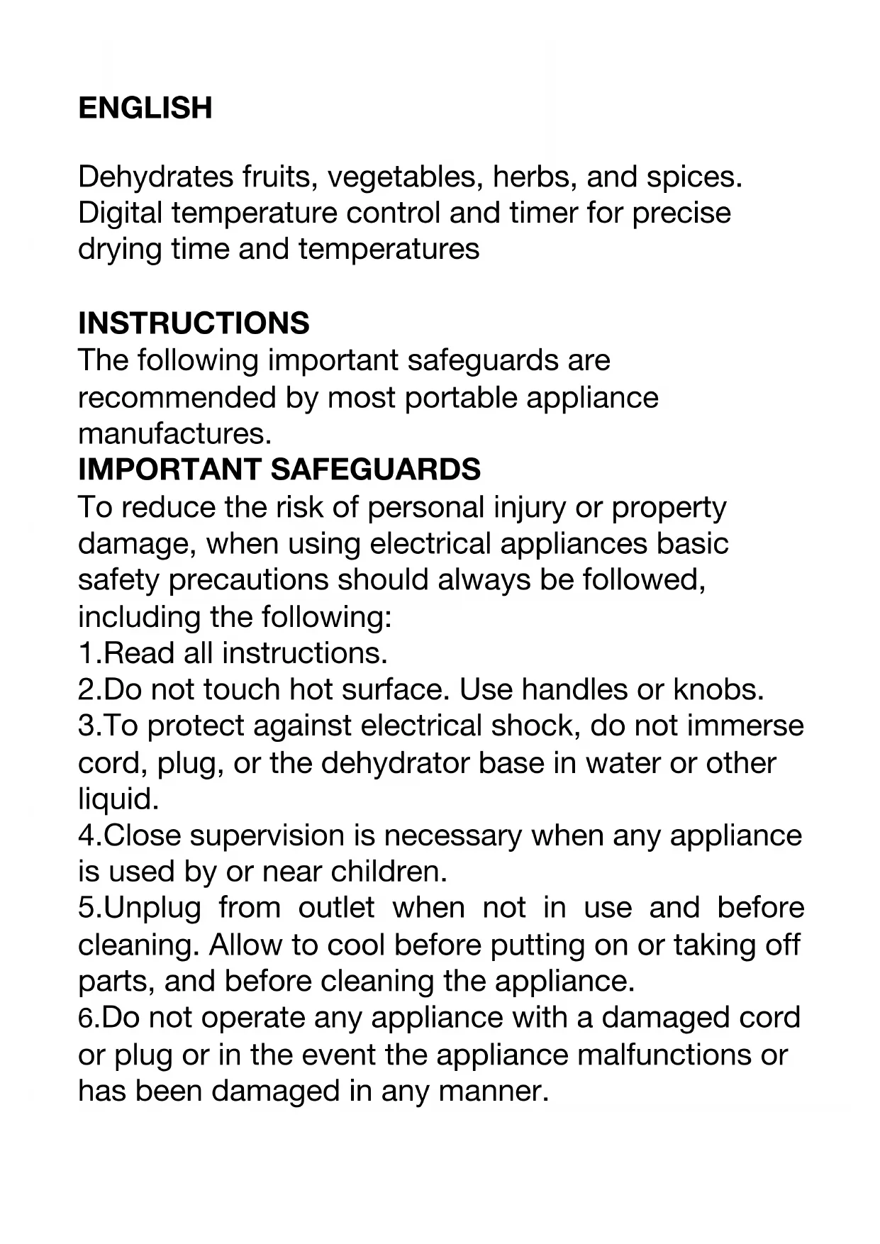 This product is for household use only How to use the digital control The digital control(Fig.c) allows for easy adjustment of adjustment dehydration temperature.In addition,it will automatically shut off the dehydrator when the selected time has elapsed. To Adjust Temperature 1.First press the start/stop button, Then Press the TIME/TEMP button and the time in the display window will begin to flash, Then Press the + or - buttons to select the desired time, to change the time hold down the + or - buttons, the time will change , timer range for this dehydrator is (1 to 48 hours)2.After the display keep time no flash, then press the TIME/TEMP button again. Press the + or - buttons to select the desired temperature up 1 press. To change the temperature rapidly,hold down the + or - buttons. The temperature range for this dehydrator is 40-70℃ Once you have the desired time and temperature set, the dehydrator will working on. At any time,you can adjust the time or temperature by using the TIME/TEMP,+ ,and - buttons. You can stop the dehydrator at any time by pressing the START/STOP button. General Dehydrating Information Safety precaution:Wash hands thoroughly prior to preparing food for dehydrating.Likewise, thoroughly clean all utensils, cutting boards,and counters that be used for preparing food. Wash food before preparing them for dehydrating. .When selecting food for drying, choose those that are at peak eating quality. Avoid overripe* or immature fruits and vegetables. Remove any parts of the food that are bruised or blemished. .For even drying, cut food into uniform size,shapes, and thickness. Drying time are highly variable depending on the type and amount of food,thickness,evenness of food pieces,humidity,air temperature,personal preference, and even the age of the plant at the time of harvesting. That is why throughout the book you will notice there is a range of average drying times. In some cases you may find you may need to, or prefer to, dry you foods for shorter or longer periods than those listed. For best results, begin checking your food at the beginning of the range listed in the instructions. You should then gauge how often you should recheck the food based on how the drying is progressing. With some foods,such as herbs, that may mean every 10 minutes, and with other foods, such as fruits,that may mean every 1-2 hours. .Dehydration prevents microbial growth, however,chemical reaction caused by enzymes in fruits and vegetables can occur unless the product is pretreated before drying.. Pretreatment will prevent or minimize undesirable color and texture changes during drying and storage. See specific sections for recommend pretreatment. .Place food in a single layer on the trays. Do not allow food to touch or overlap. .When drying the strong-smelling foods,such as onions and garlic, be aware that there will be a strong odor during the drying process. That odor may linger after drying has been complete. . Individual pieces of food may not all dry at the same time. Foods that are appropriately dried should be removed before those that still require additional drying.Always check all of the trays for food that are appropriately dried. .If one tray of food is finished before the others, remove the dried food and return the empty tray to the unit rather than rearranging the trays. .Do not add fresh fruits and vegetables to a partially dried load. This will add moisture and increase the drying time. .Allow for continuous drying. Do not unplug the dehydrator in the middle of the drying circle and resume drying at a later time as this may result in poor quality and /or unsafe food. Packaing and Storage Dried foods need to be properly packaged to prevent reabsorption of moisture and microbial deterioration. Pack food in clean,dry, airtight containers.Glass jars or freezer containers with tight-fitting lids are good for storage. Resealable plastic freezer bags are also acceptable. .Store package dried food in a dry,cool location away from light. Higher temperatures and exposure to light will shorten the storage time and result in loss of quality and nutrients. .Fruit leather/rolls should keep for up to 1 month at room temperature. Vegetables have about half the storage life as fruit. If food is to be kept longer,then store in a freezer. .Package vegetables and fruits in separate storage containers to avoid flavor transfer. Emperature mode advices: -Herbs 40-50℃ -Greens 50℃ -Bread 50℃ -Yoghurt 50℃ -Vegetables 50-55℃ -Fruits 50-60℃ -Meat, Fish 70℃ Fruit Selection and preparation. Select fruits that are at the peak of the ripeness.Wash fruits to remove dirt and debris. There are many options when it comes to drying fruit and personal preference shoud be your guide. Fruits can be sliced,halved, or if small left whole will require the most drying time. Slice fruit uniformly and in piece about 1/4 inch thick. Fruits that are left whole ,such as blueberries,cranberries and grapes, should be dipped in boiling water for 30-60 seconds and then plunged in ice water to crack the skin. This procedure will reduce the drying time.Pretreatment Many fruits will darked quickly once they are peeled and/or cut and will continue to darken even after the fruit is dried. This is due to the exposure of the natural enzymes in some fruits to air. There are several pretreatment options to prevent this discoloration Pretreatment is not necessary but is recommends to prevent discoloration .Some people may detect a slight flavor change with pretreated fruit. See the Fruit Drying Guide on page 6 to determine which fruit will benefit from the pretreatment. You may want to dry the different options and see which you prefer. Ascorbic acid(Vitamin C)-Ascorbic acid, available in tablet or powdered form, is available at drugstores. Mix 2 1/2 tablespoons of powder ascorbic acid in 1 quart cold water. Vitamin C tablet(six 500mg.tablets equal 1 teaspoons ascorbic acid) should be crushed before mixing with water