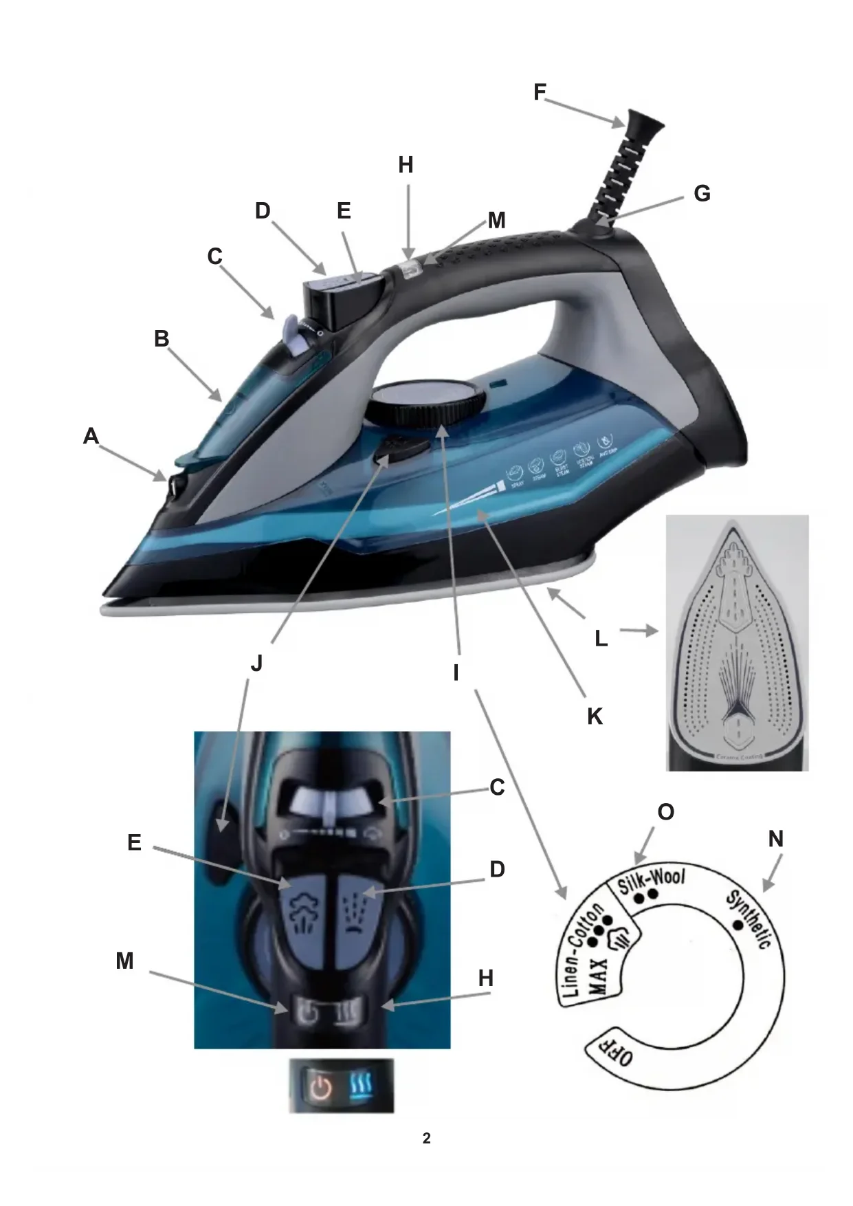 K. Water tank L. Ceramic coated soleplate M. Power indicator light N. Synthetic fabric – one drop O. Silk – Wool fabric – two drops