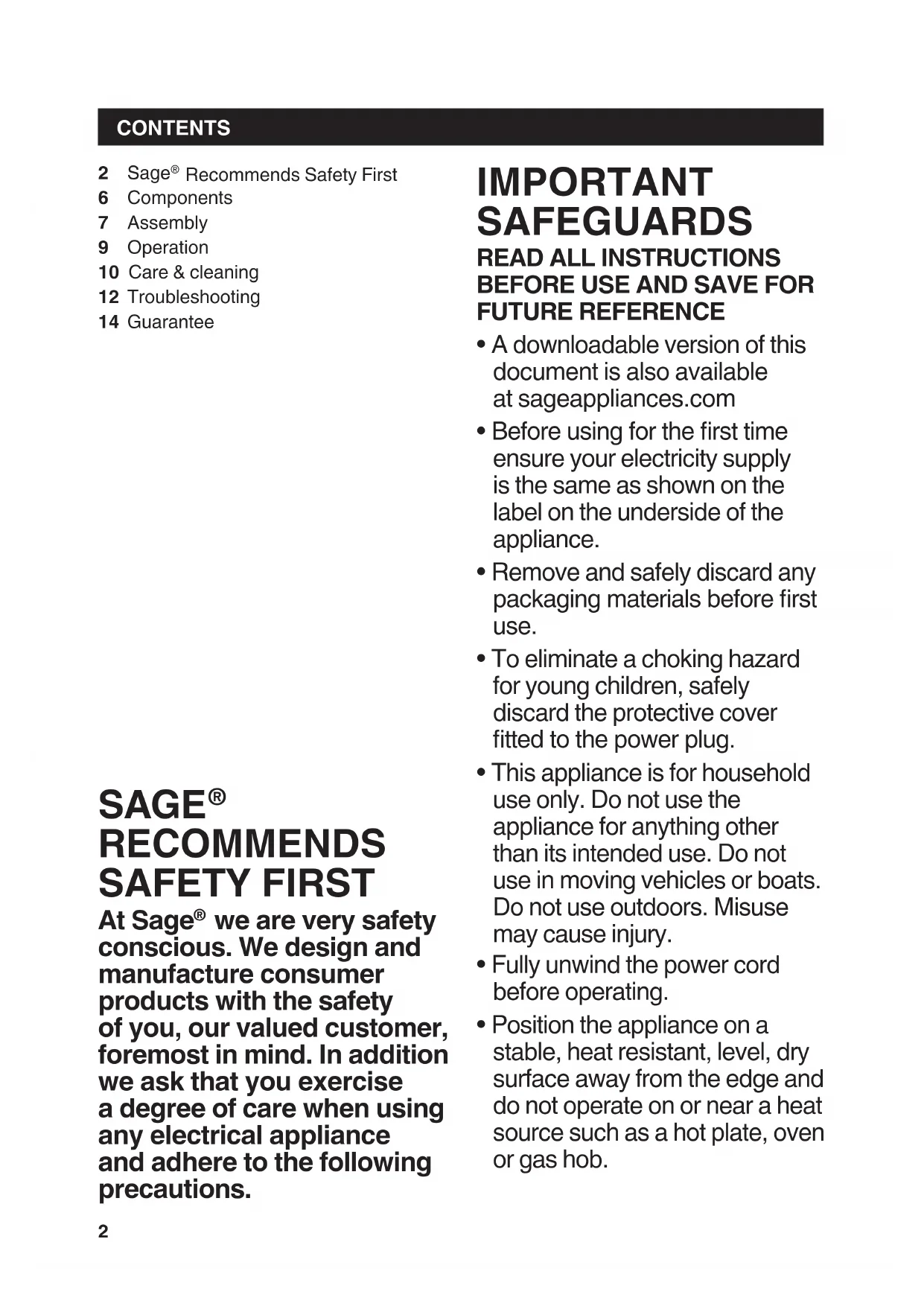 MOTOR GUARANTEE Sage Appliances guarantees this product for domestic use in specied territories for 2 years for all parts of the product and 5 years for the product’s motor from the date of purchase against defects caused by faulty workmanship and materials. During this guarantee period Sage Appliances will repair, replace, or refund any defective product (at the sole discretion of Sage Appliances). All legal warranty rights under applicable national legislation will be respected and will not be impaired by our guarantee. For full terms and conditions on the guarantee, as well as instructions on how to make a claim, please visit www.sageappliances.com.the User Guide B###### / S###### DE HANDBUCH2 INHALT WICHTIGE SICHERHEITS HINWEISE Bei Sage