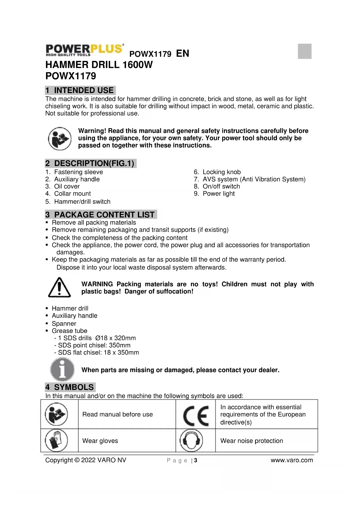 - Remove any adjusting key or wrench before turning the power tool on. A wrench or a key left attached to a rotating part of the power tool may result in personal injury.POWX1179 EN Copyright © 2022 VARO NV P a g e | 5 www.varo.com