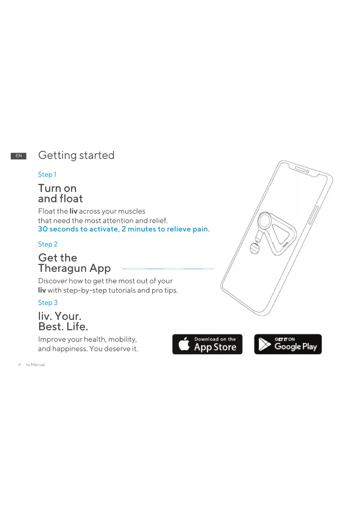 Step 2 Get the Theragun App Discover how to get the most out of your liv with step-by-step tutorials and pro tips. Step 3 liv. Your. Best. Life. Improve your health, mobility, and happiness. You deserve it. Getting started Step 1 Turn on and float Float the liv across your muscles that need the most attention and relief. 30 seconds to activate, 2 minutes to relieve pain.liv Manual 5
