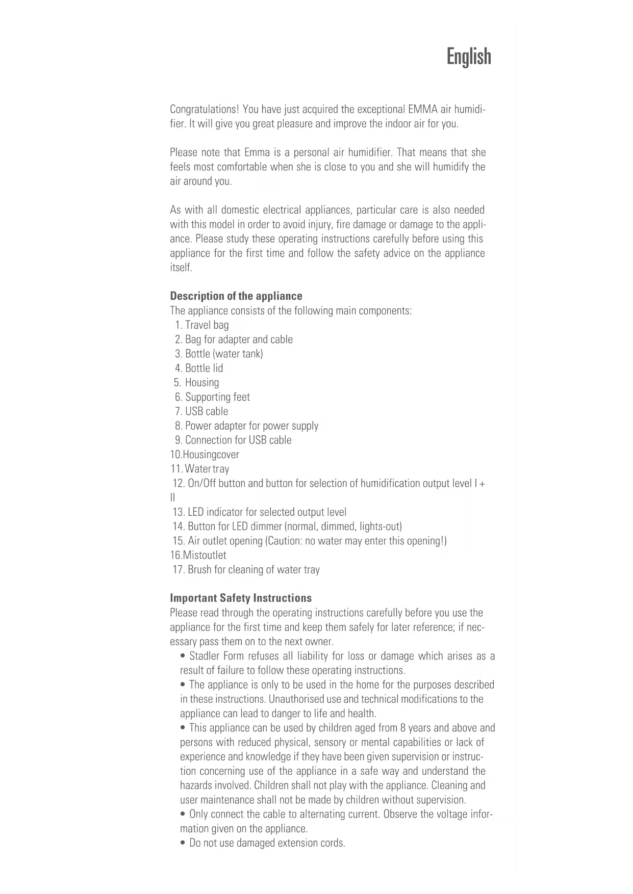 A B CStadler Form Aktiengesellschaft, Chamerstrasse 174, 6300 Zug, Switzerland Phone +41 41 720 48 48, Fax +41 41 720 48 44, www.stadlerform.com/contact Share your feedback about Emma on: Teilen Sie Ihr Feedback von Emma auf: Partagez votre commentaire sur Emma : www.stadlerform.com/Reviews Download instruction manual: Bedienungsanleitung hier herunterladen: Téléchargez le mode d’emploi : www.stadlerform.com/Emma/manual For frequently asked questions go to: Für häufig gestellte Fragen besuchen Sie: Trouvez la foire aux questions sur : www.stadlerform.com/Emma/support Watch the video of Emma: Schauen Sie sich das Video zu Emma an: Regardez la vidéo du Emma : www.stadlerform.com/Emma/videoEnglish Congratulations! You have just acquired the exceptional EMMA air humidi- fier. It will give you great pleasure and improve the indoor air for you. Please note that Emma is a personal air humidifier. That means that she feels most comfortable when she is close to you and she will humidify the air around you. As with all domestic electrical appliances, particular care is also needed with this model in order to avoid injury, fire damage or damage to the appli- ance. Please study these operating instructions carefully before using this appliance for the first time and follow the safety advice on the appliance itself. Description of the appliance The appliance consists of the following main components: