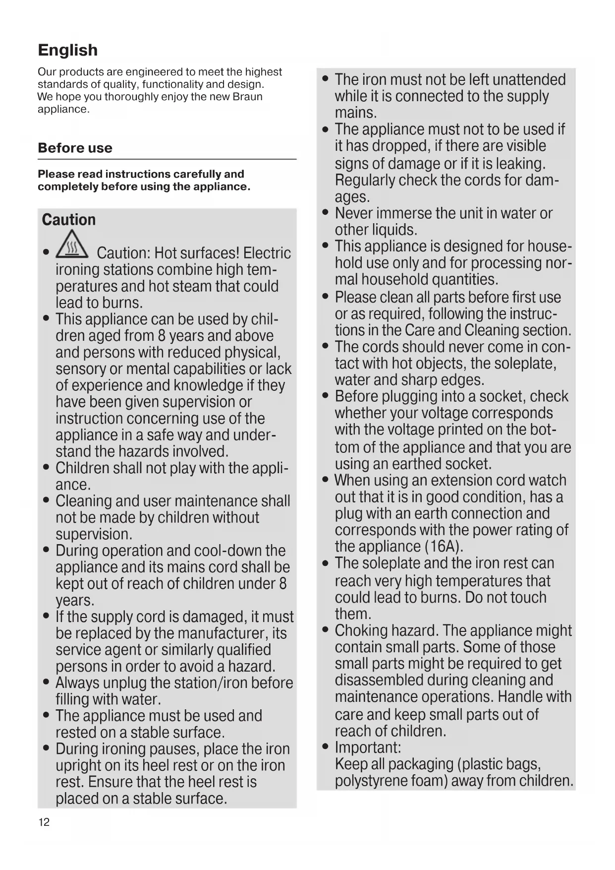 Caution: Hot surfaces! Electric ironing stations combine high tem- peratures and hot steam that could lead to burns.