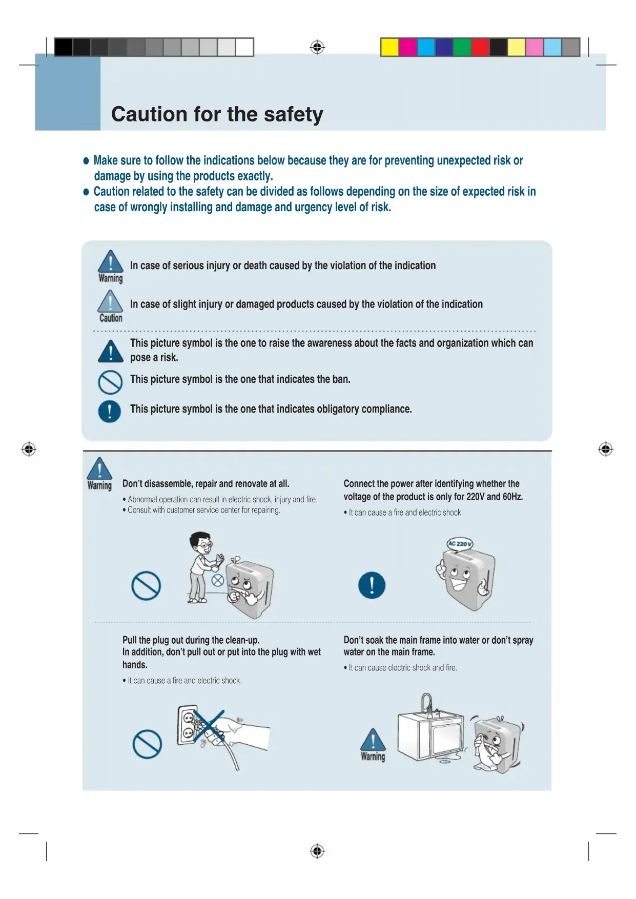 - It can cause electric shock and fire. ● Make sure to follow the indications below because they are for preventing unexpected risk or damage by using the products exactly. ● Caution related to the safety can be divided as follows depending on the size of expected risk in case of wrongly installing and damage and urgency level of risk. In case of serious injury or death caused by the violation of the indication In case of slight injury or damaged products caused by the violation of the indication This picture symbol is the one that indicates the ban. This picture symbol is the one that indicates obligatory compliance. This picture symbol is the one to raise the awareness about the facts and organization which can pose a risk. Caution for the safetyBefore using