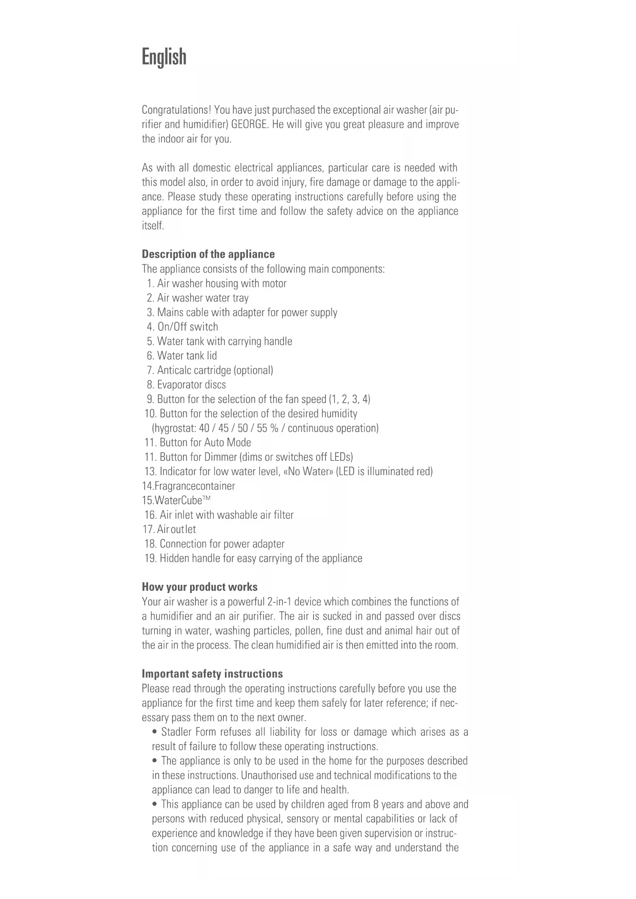 Download the instructions for your Humidifier in PDF format for free! Find your manual George - STADLER FORM and take your electronic device back in hand. On this page are published all the documents necessary for the use of your device. George by STADLER FORM.
