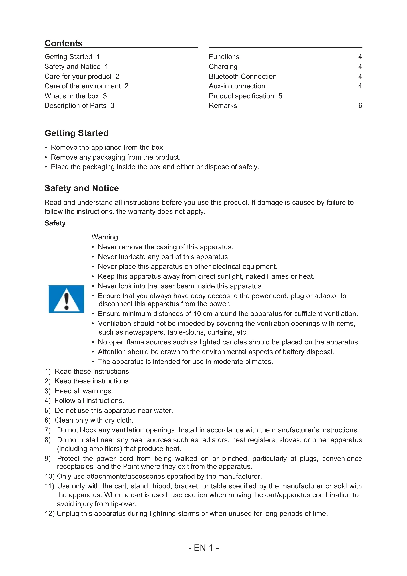 Getting Started 1 Safety and Notice 1 Care for your product 2 Care of the environment 2 What’s in the box 3 Description of Parts 3 Functions: 4 Charging: 4 Bluetooth Connection: 4 Aux-in connection: 4 Product specication 5 Remarks: 6 Contents- EN 2 -