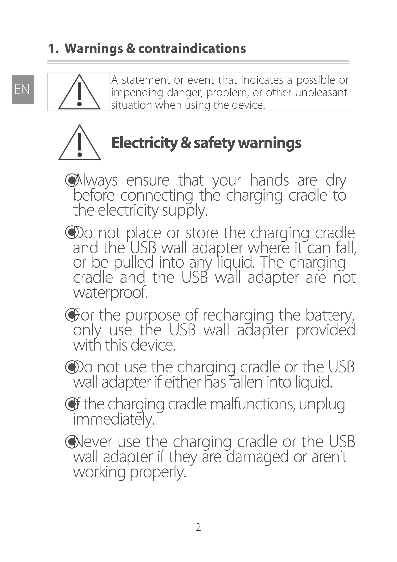 Always ensure that your hands are dry before connecting the charging cradle to the electricity supply.
