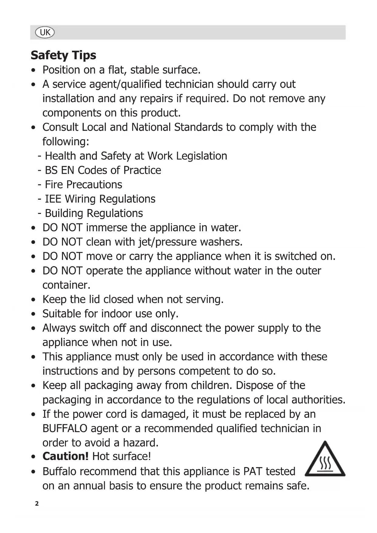 - Buffalo recommend that this appliance is PAT tested on an annual basis to ensure the product remains safe.