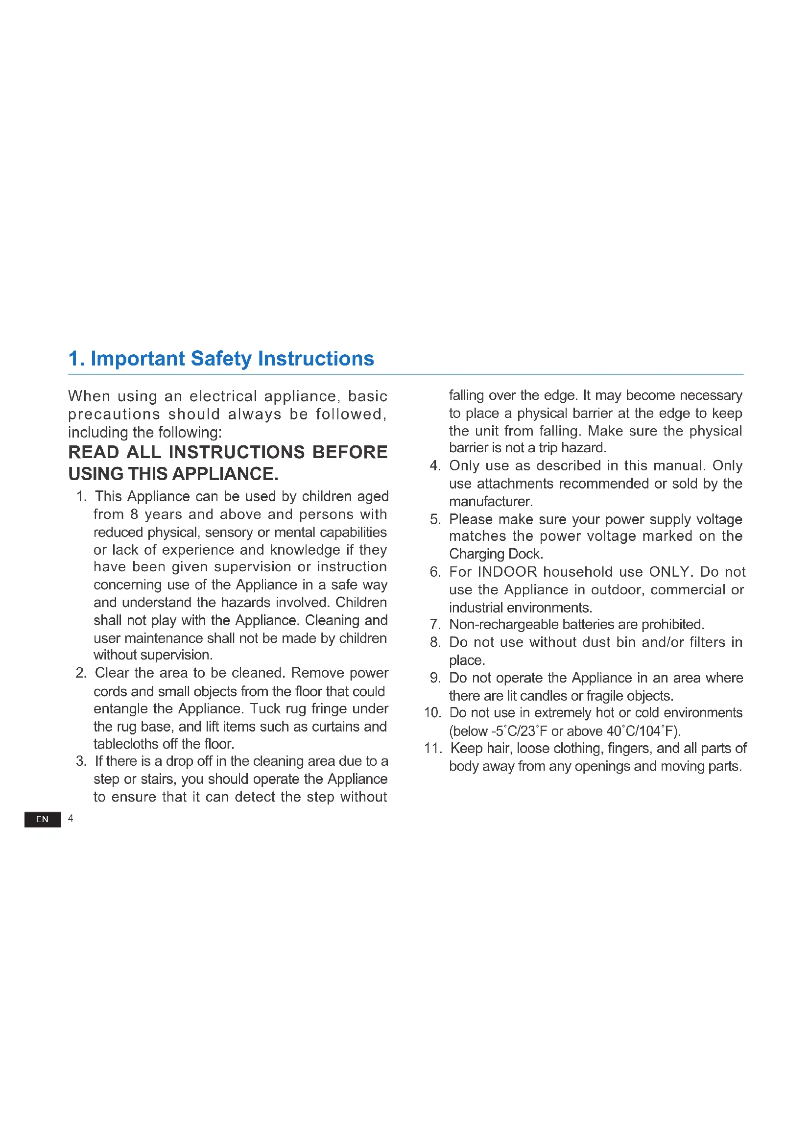 or receptacle. Do not use the Appliance or Charging Dock if it is not working properly, has been dropped, damaged, left outdoors, or come in contact with water. It must be repaired by the manufacturer or its service agent in order to avoid a hazard.