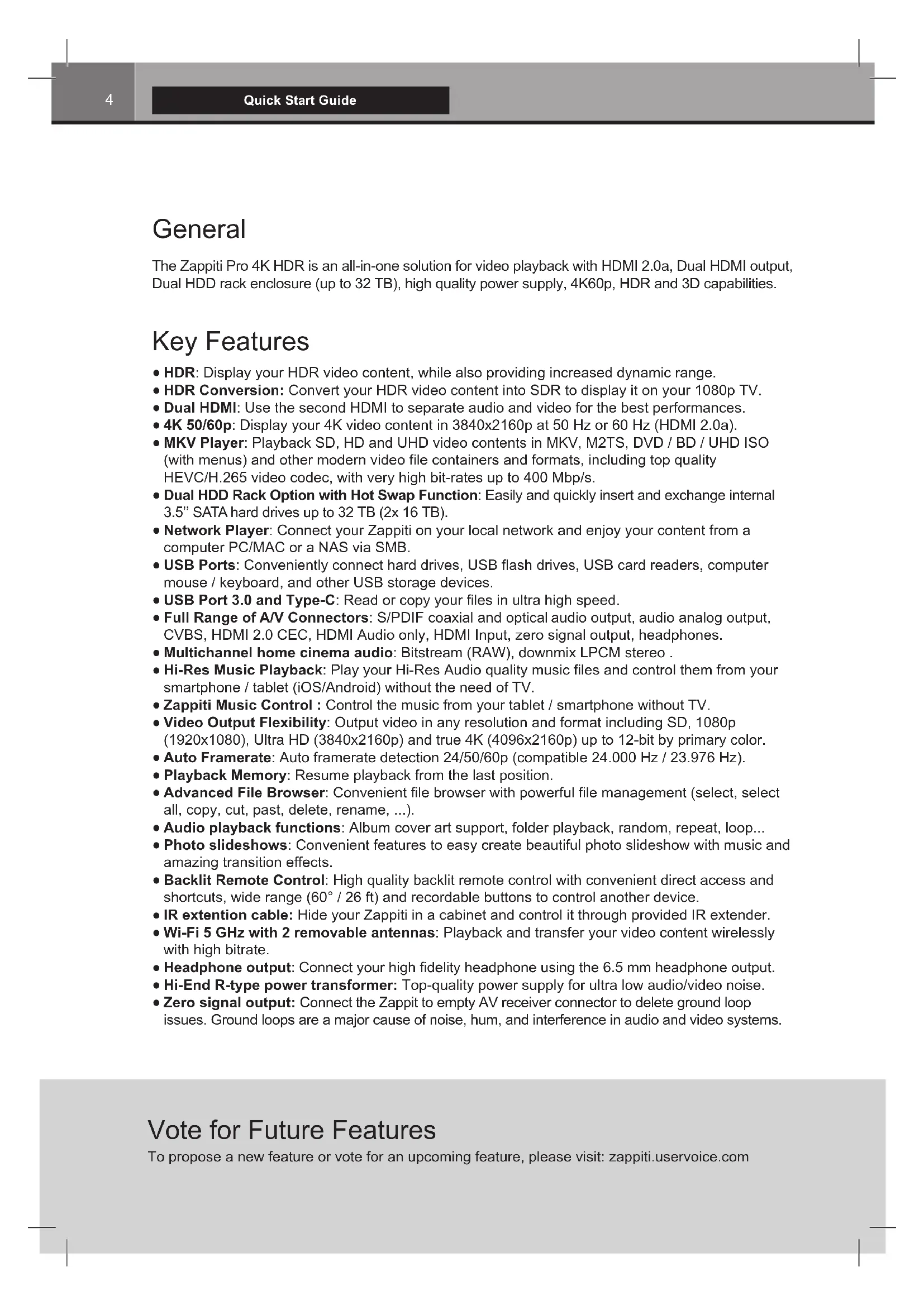 Quick Start Guide Vote for Future Features To propose a new feature or vote for an upcoming feature, please visit: zappiti.uservoice.com General The Zappiti Pro 4K HDR is an all-in-one solution for video playback with HDMI 2.0a, Dual HDMI output, Dual HDD rack enclosure (up to 32 TB), high quality power supply, 4K60p, HDR and 3D capabilities. Key Features HDR: Display your HDR video content, while also providing increased dynamic range. HDR Conversion: Convert your HDR video content into SDR to display it on your 1080p TV. Dual HDMI: Use the second HDMI to separate audio and video for the best performances. 4K 50/60p: Display your 4K video content in 3840x2160p at 50 Hz or 60 Hz (HDMI 2.0a). MKV Player: Playback SD, HD and UHD video contents in MKV, M2TS, DVD / BD / UHD ISO (with menus) and other modern video file containers and formats, including top quality HEVC/H.265 video codec, with very high bit-rates up to 400 Mbp/s. Dual HDD Rack Option with Hot Swap Function: Easily and quickly insert and exchange internal 3.5’’ SATA hard drives up to 32 TB (2x 16 TB). Network Player: Connect your Zappiti on your local network and enjoy your content from a computer PC/MAC or a NAS via SMB. USB Ports: Conveniently connect hard drives, USB flash drives, USB card readers, computer mouse / keyboard, and other USB storage devices. USB Port 3.0 and Type-C: Read or copy your files in ultra high speed. Full Range of A/V Connectors: S/PDIF coaxial and optical audio output, audio analog output, CVBS, HDMI 2.0 CEC, HDMI Audio only, HDMI Input, zero signal output, headphones. Multichannel home cinema audio: Bitstream (RAW), downmix LPCM stereo . Hi-Res Music Playback: Play your Hi-Res Audio quality music files and control them from your smartphone / tablet (iOS/Android) without the need of TV. Zappiti Music Control : Control the music from your tablet / smartphone without TV. Video Output Flexibility: Output video in any resolution and format including SD, 1080p (1920x1080), Ultra HD (3840x2160p) and true 4K (4096x2160p) up to 12-bit by primary color. Auto Framerate: Auto framerate detection 24/50/60p (compatible 24.000 Hz / 23.976 Hz). Playback Memory: Resume playback from the last position. Advanced File Browser: Convenient file browser with powerful file management (select, select all, copy, cut, past, delete, rename, ...). Audio playback functions: Album cover art support, folder playback, random, repeat, loop... Photo slideshows: Convenient features to easy create beautiful photo slideshow with music and amazing transition effects. Backlit Remote Control: High quality backlit remote control with convenient direct access and shortcuts, wide range (60° / 26 ft) and recordable buttons to control another device. IR extention cable: Hide your Zappiti in a cabinet and control it through provided IR extender. Wi-Fi 5 GHz with 2 removable antennas: Playback and transfer your video content wirelessly with high bitrate. Headphone output: Connect your high fidelity headphone using the 6.5 mm headphone output. Hi-End R-type power transformer: Top-quality power supply for ultra low audio/video noise. Zero signal output: Connect the Zappit to empty AV receiver connector to delete ground loop issues. Ground loops are a major cause of noise, hum, and interference in audio and video systems.