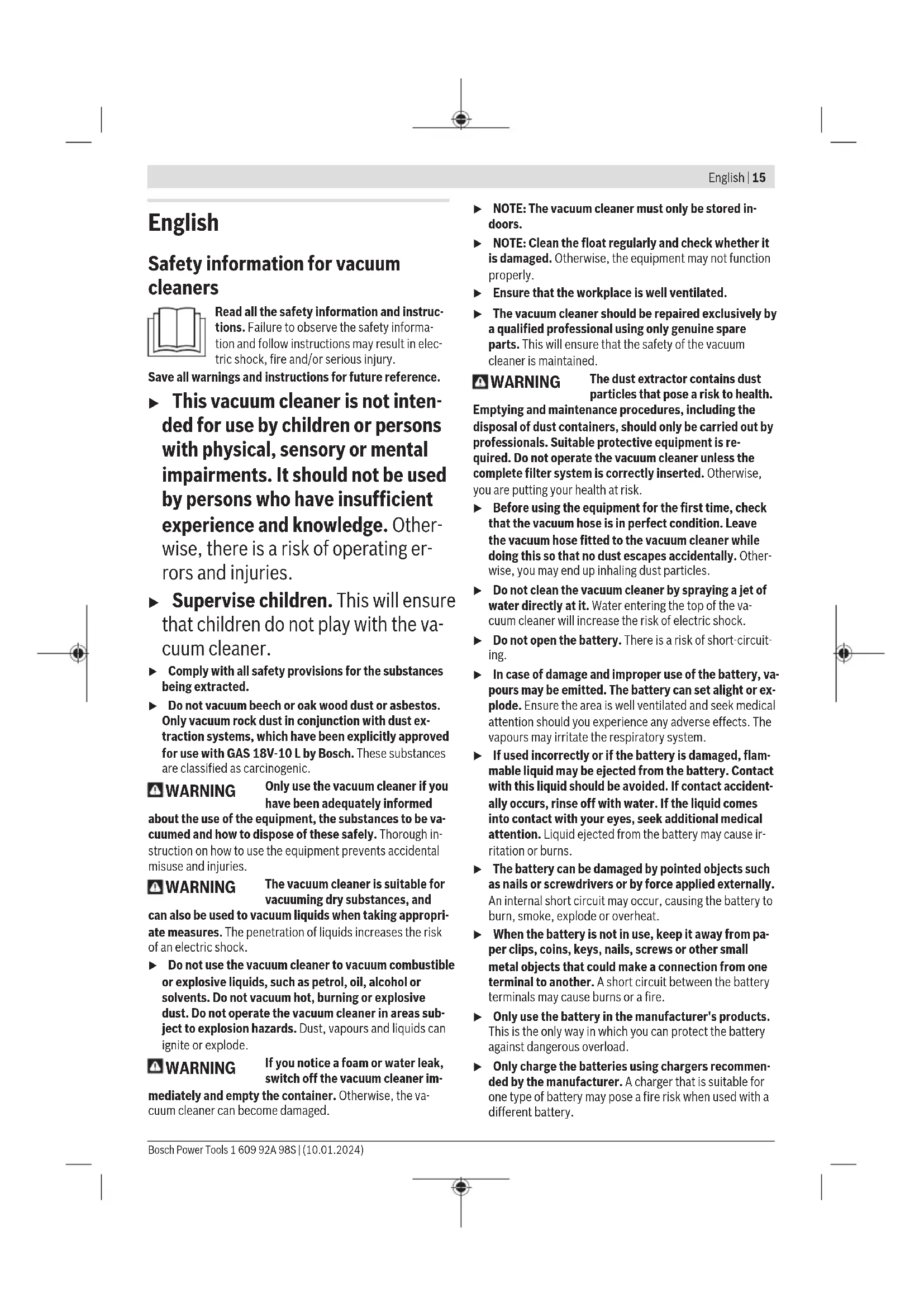 äußeren Abmessung größer als 25cm sind, im Einzel- handelsgeschäft oder in unmittelbarer Nähe hierzu un- entgeltlich zurückzunehmen; die Rücknahme darf nicht an den Kauf eines Elektro- oder Elektronikgerätes ge- knüpft werden und ist auf drei Altgeräte pro Geräteart beschränkt. Der Vertreiber hat beim Abschluss des Kaufvertrags für das neue Elektro- oder Elektronikgerät den Endnutzer über die Möglichkeit zur unentgeltlichen Rückgabe bzw. Abholung des Altgeräts zu informieren und den Endnutzer nach seiner Absicht zu befragen, ob bei der Auslieferung des neuen Ge- räts ein Altgerät zurückgegeben wird. Dies gilt auch bei Vertrieb unter Verwendung von Fernkom- munikationsmitteln, wenn die Lager- und Versandflächen für Elektro- und Elektronikgeräte mindestens 400m² betragen oder die gesamten Lager- und Versandflächen mindestens 800m² betragen, wobei die unentgeltliche Abholung auf Elektro- und Elektronikgeräte der Kategorien 1 (Wärmeüber- träger), 2 (Bildschirmgeräte) und 4 (Großgeräte mit mindes- tens einer äußeren Abmessung über 50cm) beschränkt ist. Für alle übrigen Elektro- und Elektronikgeräte muss der Ver- treiber geeignete Rückgabemöglichkeiten in zumutbarer Ent- fernung zum jeweiligen Endnutzer gewährleisten; das gilt auch für Altgeräte, die in keiner äußeren Abmessung größer als 25cm sind, die der Endnutzer zurückgeben will, ohne ein neues Gerät zu kaufen. Akkus/Batterien: Li-Ion: Bitte beachten Sie die Hinweise im Abschnitt Transport (sie- he „Transport“, Seite14). 1 609 92A 98S | (10.01.2024) Bosch Power ToolsEnglish | 15 English Safety information for vacuum cleaners Read all the safety information and instruc- tions. Failure to observe the safety informa- tion and follow instructions may result in elec- tric shock, fire and/or serious injury. Save all warnings and instructions for future reference. u This vacuum cleaner is not inten- ded for use by children or persons with physical, sensory or mental impairments. It should not be used by persons who have insufficient experience and knowledge. Other- wise, there is a risk of operating er- rors and injuries. u Supervise children. This will ensure that children do not play with the va- cuum cleaner. u Comply with all safety provisions for the substances being extracted. u Do not vacuum beech or oak wood dust or asbestos. Only vacuum rock dust in conjunction with dust ex- traction systems, which have been explicitly approved for use withGAS 18V-10 L byBosch. These substances are classified as carcinogenic. WARNING Only use the vacuum cleaner if you have been adequately informed about the use of the equipment, the substances to be va- cuumed and how to dispose of these safely. Thorough in- struction on how to use the equipment prevents accidental misuse and injuries. WARNING The vacuum cleaner is suitable for vacuuming dry substances, and can also be used to vacuum liquids when taking appropri- ate measures. The penetration of liquids increases the risk of an electric shock. u Do not use the vacuum cleaner to vacuum combustible or explosive liquids, such as petrol, oil, alcohol or solvents. Do not vacuum hot, burning or explosive dust. Do not operate the vacuum cleaner in areas sub- ject to explosion hazards. Dust, vapours and liquids can ignite or explode. WARNING If you notice a foam or water leak, switch off the vacuum cleaner im- mediately and empty the container. Otherwise, the va- cuum cleaner can become damaged. u NOTE: The vacuum cleaner must only be stored in- doors. u NOTE: Clean the float regularly and check whether it is damaged. Otherwise, the equipment may not function properly. u Ensure that the workplace is well ventilated.u The vacuum cleaner should be repaired exclusively by a qualified professional using only genuine spare parts. This will ensure that the safety of the vacuum cleaner is maintained. WARNING The dust extractor contains dust particles that pose a risk to health. Emptying and maintenance procedures, including the disposal of dust containers, should only be carried out by professionals. Suitable protective equipment is re- quired. Do not operate the vacuum cleaner unless the complete filter system is correctly inserted. Otherwise, you are putting your health at risk. u Before using the equipment for the first time, check that the vacuum hose is in perfect condition. Leave the vacuum hose fitted to the vacuum cleaner while doing this so that no dust escapes accidentally. Other- wise, you may end up inhaling dust particles. u Do not clean the vacuum cleaner by spraying a jet of water directly at it. Water entering the top of the va- cuum cleaner will increase the risk of electric shock. u Do not open the battery. There is a risk of short-circuit- ing. u In case of damage and improper use of the battery, va- pours may be emitted. The battery can set alight or ex- plode. Ensure the area is well ventilated and seek medical attention should you experience any adverse effects. The vapours may irritate the respiratory system. u If used incorrectly or if the battery is damaged, flam- mable liquid may be ejected from the battery. Contact with this liquid should be avoided. If contact accident- ally occurs, rinse off with water. If the liquid comes into contact with your eyes, seek additional medical attention. Liquid ejected from the battery may cause ir- ritation or burns. u The battery can be damaged by pointed objects such as nails or screwdrivers or by force applied externally. An internal short circuit may occur, causing the battery to burn, smoke, explode or overheat. u When the battery is not in use, keep it away from pa- per clips, coins, keys, nails, screws or other small metal objects that could make a connection from one terminal to another. A short circuit between the battery terminals may cause burns or a fire. u Only use the battery in the manufacturer's products. This is the only way in which you can protect the battery against dangerous overl