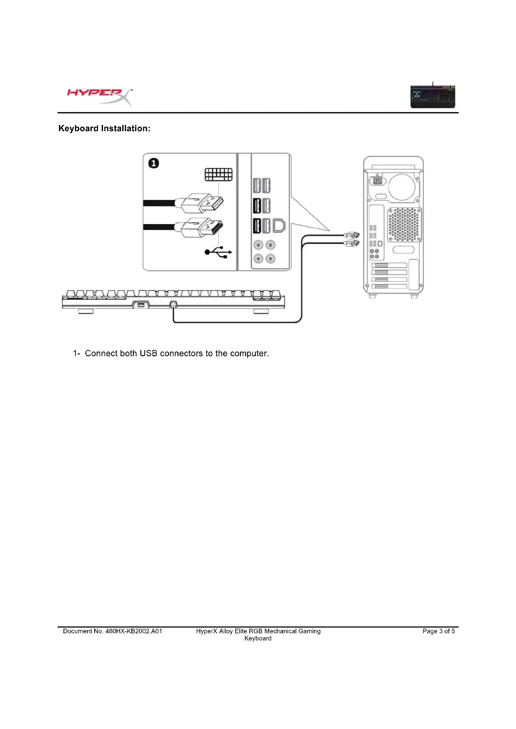 1- Connect both USB connectors to the computer.Document No. 480HX-KB2002.A01
