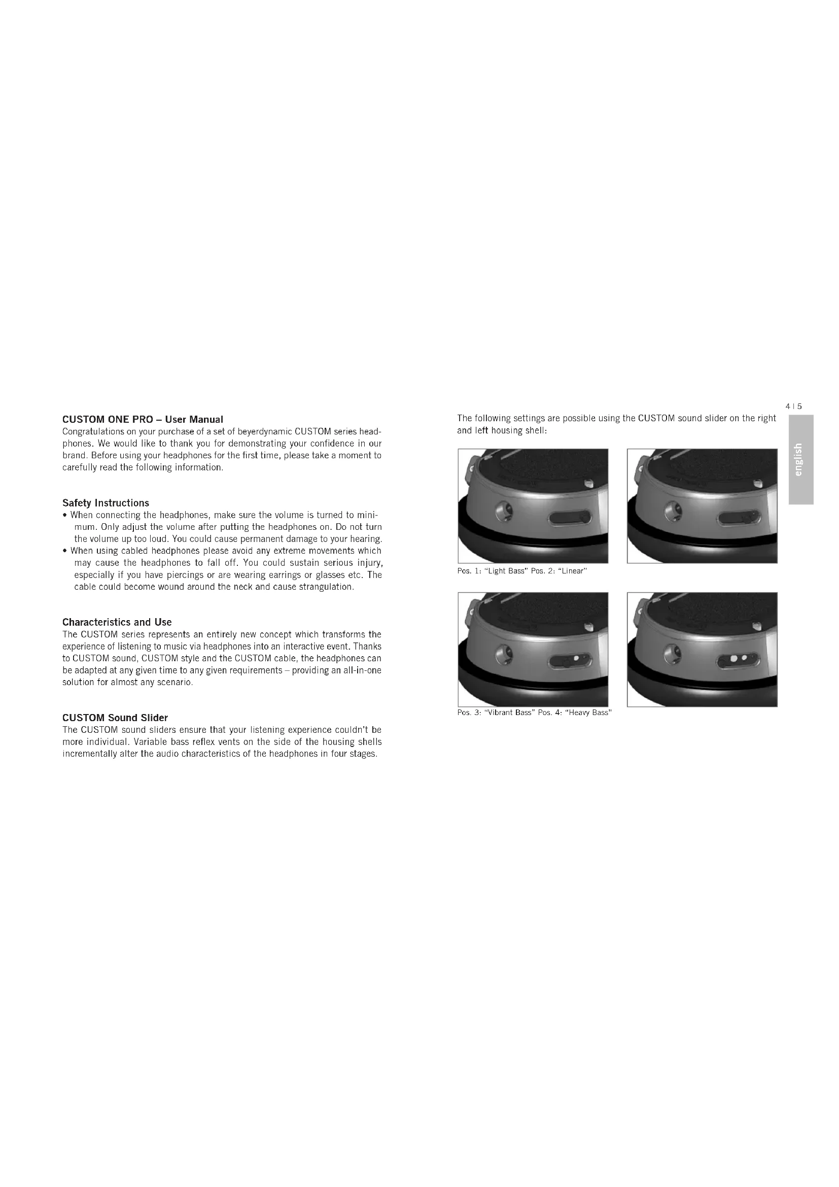 - When using cabled headphones please avoid any extreme movements which may cause the headphones to fall off. You could sustain serious injury, especially if you have piercings or are wearing earrings or glasses etc. The cable could become wound around the neck and cause strangulation. Characteristics and Use The CUSTOM series represents an entirely new concept which transforms the experience of listening to music via headphones into an interactive event. Thanks to CUSTOM sound, CUSTOM style and the CUSTOM cable, the headphones can be adapted at any given time to any given requirements – providing an all-in-one solution for almost any scenario. CUSTOM Sound Slider The CUSTOM sound sliders ensure that your listening experience couldn’t be more individual. Variable bass reflex vents on the side of the housing shells incrementally alter the audio characteristics of the headphones in four stages. The following settings are possible using the CUSTOM sound slider on the right and left housing shell: Pos. 1: “Light Bass” Pos. 2: “Linear” Pos. 3: “Vibrant Bass” Pos. 4: “Heavy Bass”english 6 | 7 CUSTOM ONE PRO – Sound Patterns CUSTOM Noise Isolation A further feature of the innovative CUSTOM sound slider: closing the headphones gradually increases sound isolation. Ambient noise such as the humming of aeroplane engines or street noise is attenuated considerably. CUSTOM Style The headphones are not only interactive in terms of sound but also design. The rings, covers and ear pads of the headphone shells can be exchanged just as easily as the headband pad. All accessories can be found at: www.beyerdynamic.com/custom Changing covers and/or rings