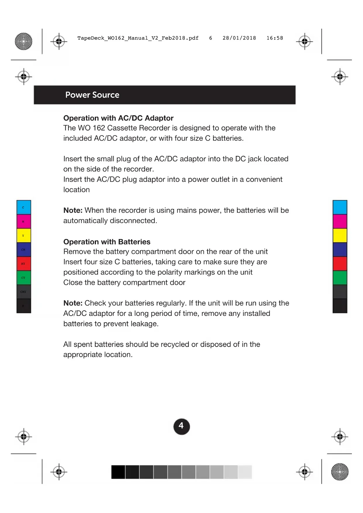 TapeDeck_WO162_Manual_V2_Feb2018.pdf 5 28/01/2018 16:584 Power Source Operation with AC/DC Adaptor The WO 162 Cassette Recorder is designed to operate with the included AC/DC adaptor, or with four size C batteries. Insert the small plug of the AC/DC adaptor into the DC jack located on the side of the recorder. Insert the AC/DC plug adaptor into a power outlet in a convenient location Note: When the recorder is using mains power, the batteries will be automatically disconnected. Operation with Batteries Remove the battery compartment door on the rear of the unit Insert four size C batteries, taking care to make sure they are positioned according to the polarity markings on the unit Close the battery compartment door Note: Check your batteries regularly. If the unit will be run using the AC/DC adaptor for a long period of time, remove any installed batteries to prevent leakage. All spent batteries should be recycled or disposed of in the appropriate location.