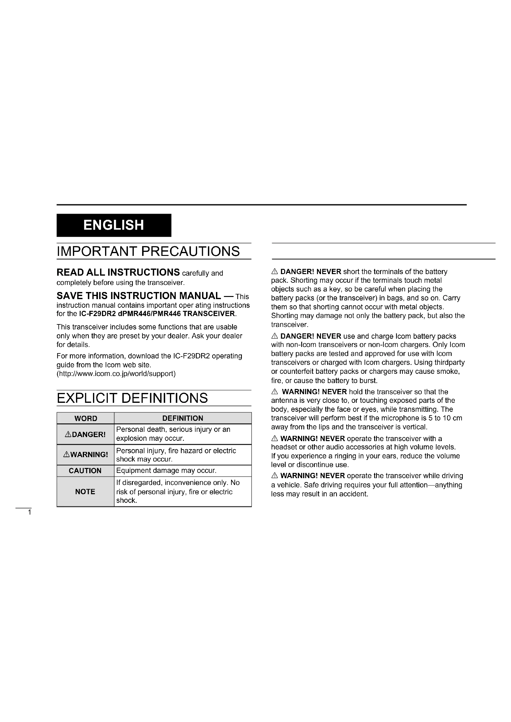 READ ALL INSTRUCTIONS carefully and completely before using the transceiver. SAVE THIS INSTRUCTION MANUAL — This instruction manual contains important oper ating instructions for the IC-F29DR2 dPMR446/PMR446 TRANSCEIVER. This transceiver includes some functions that are usable only when they are preset by your dealer. Ask your dealer for details. For more information, download the IC-F29DR2 operating guide from the Icom web site. (http://www.icom.co.jp/world/support) EXPLICIT DEFINITIONS WORD DEFINITION RDANGER! Personal death, serious injury or an explosion may occur. RWARNING! Personal injury, re hazard or electric shock may occur. CAUTION Equipment damage may occur. NOTE If disregarded, inconvenience only. No risk of personal injury, re or electric shock. IMPORTANT PRECAUTIONS R DANGER! NEVER short the terminals of the battery pack. Shorting may occur if the terminals touch metal objects such as a key, so be careful when placing the battery packs (or the transceiver) in bags, and so on. Carry them so that shorting cannot occur with metal objects. Shorting may damage not only the battery pack, but also the transceiver. R DANGER! NEVER use and charge Icom battery packs with non-Icom transceivers or non-Icom chargers. Only Icom battery packs are tested and approved for use with Icom transceivers or charged with Icom chargers. Using thirdparty or counterfeit battery packs or chargers may cause smoke, re, or cause the battery to burst. R WARNING! NEVER hold the transceiver so that the antenna is very close to, or touching exposed parts of the body, especially the face or eyes, while transmitting. The transceiver will perform best if the microphone is 5 to 10 cm away from the lips and the transceiver is vertical. R WARNING! NEVER operate the transceiver with a headset or other audio accessories at high volume levels. If you experience a ringing in your ears, reduce the volume level or discontinue use. R WARNING! NEVER operate the transceiver while driving a vehicle. Safe driving requires your full attention—anything less may result in an accident. ENGLISH2 ENGLISH CAUTION: DO NOT operate the transceiver unless the exible antenna, battery pack and jack cover are securely attached. Conrm that the antenna and battery pack are dry before attaching. Exposing the inside of the transceiver to dust or water can cause serious damage to the transceiver.