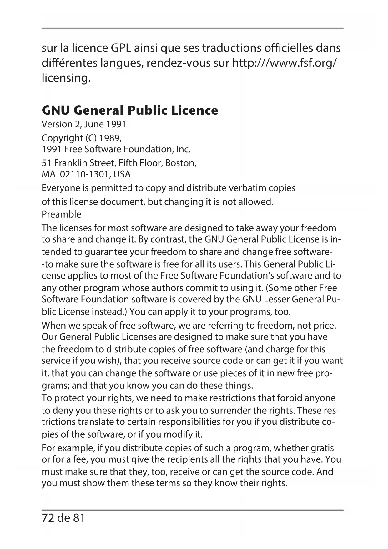 it, thus forming a work based on the Program, and copy and distribute such modifications or work under the terms of Section 1 above, provi- ded that you also meet all of these conditions: a) You must cause the modified files to carry prominent notices stating that you changed the files and the date of any change. b) You must cause any work that you distribute or publish, that in whole or in part contains or is derived from the Program or any part thereof, to be licensed as a whole at no charge to all third parties under the terms of this License. c) If the modified program normally reads commands interactively when run, you must cause it, when started running for such interactive use in the most ordinary way, to print or display an announcement including an appropriate copyright notice and a notice that there is no warranty (or else, saying that you provide a warranty) and that users may redistri- bute the program under these conditions, and telling the user how to view a copy of this License. (Exception: if the Program itself is interactive but does not normally print such an announcement, your work based on the Program is not required to print an announcement.) E7316 FR Generic Final Content.indd 74E7316 FR Generic Final Content.indd 74 31.10.2013 15:50:4831.10.2013 15:50:4875 de 81 These requirements apply to the modified work as a whole. If identi- fiable sections of that work are not derived from the Program, and can be reasonably considered independent and separate works in them- selves, then this License, and its terms, do not apply to those sections when you distribute them as separate works. But when you distribute the same sections as part of a whole which is a work based on the Pro- gram, the distribution of the whole must be on the terms of this License, whose permissions for other licensees extend to the entire whole, and thus to each and every part regardless of who wrote it. Thus, it is not the intent of this section to claim rights or contest your rights to work written entirely by you; rather, the intent is to exercise the right to control the distribution of derivative or collective works based on the Program. In addition, mere aggregation of another work not based on the Pro- gram with the Program (or with a work based on the Program) on a vo- lume of a storage or distribution medium does not bring the other work under the scope of this License.
