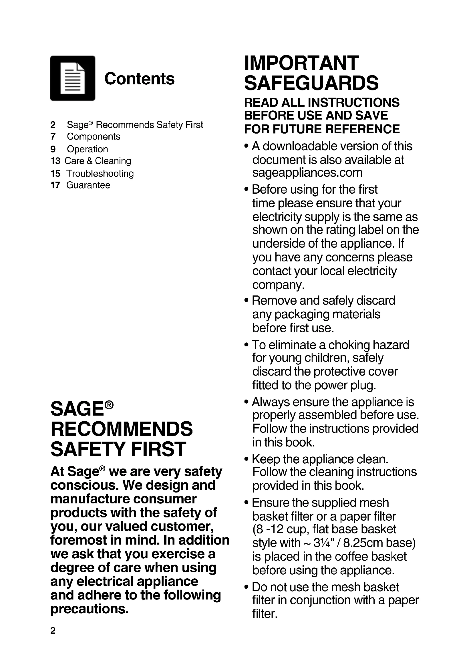 - Do not use the mesh basket lter in conjunction with a paper lter. 2 Sage Recommends Safety First7 Components9 Operation13 Care & Cleaning15 Troubleshooting17 Guarantee Contents3