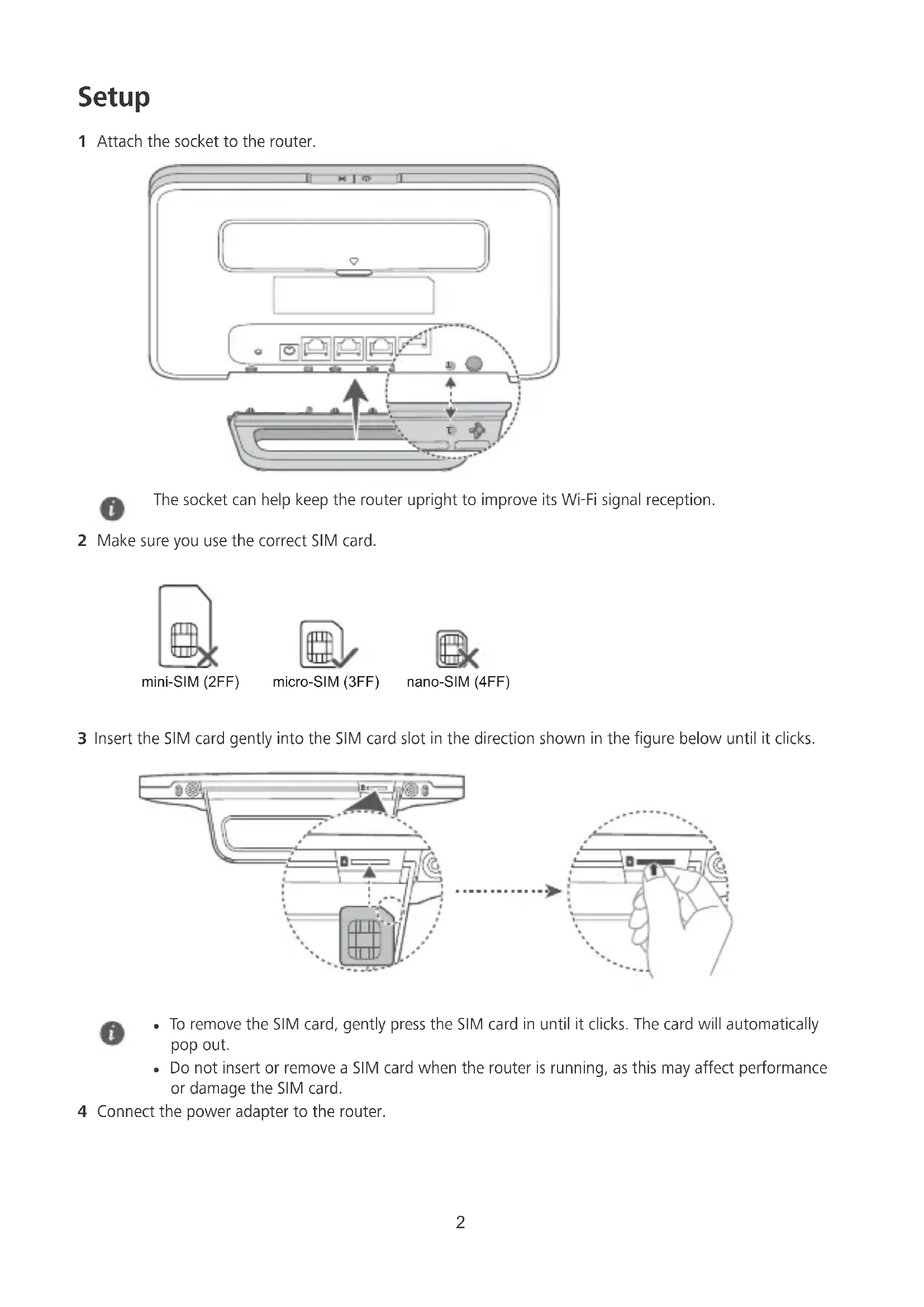 The socket can help keep the router upright to improve its Wi-Fi signal reception. 2 Make sure you use the correct SIM card. mini-SIM (2FF) micro-SIM (3FF) nano-SIM (4FF) 3 Insert the SIM card gently into the SIM card slot in the direction shown in the gure below until it clicks. l To remove the SIM card, gently press the SIM card in until it clicks. The card will automatically pop out. l Do not insert or remove a SIM card when the router is running, as this may affect performance or damage the SIM card. 4 Connect the power adapter to the router. 2The indicators will turn on when the router has successfully connected to a network. Network status indicator Cyan/blue: Connected to an LTE/3G network. Signal strength indicator White: More signal bars indicate a stronger signal. If the Network status indicator is red, it indicates there is no network connection. Please refer to the FAQs in this guide. 3Connecting to your router's Wi-Fi network Wi-Fi Name˖ Wi-Fi Password˖ Wi-Fi Password Wi-Fi Password: Once the router has connected to a mobile data network, you can connect your computer or mobile phone to the router's Wi-Fi network to access the Internet. Please refer to the label on the back of the router for the default Wi-Fi network name (Wi-Fi Name) and password (Wi-Fi Password). l When the Wi-Fi indicator is steady on, Wi-Fi is enabled. To enable or disable Wi-Fi, refer to the router's web-based management page. l Ensure that you promptly change the Wi-Fi network name and password on the web-based management page to prevent unauthorized access to your Wi-Fi network. Once you have changed the password, you will need to reconnect to the router's Wi-Fi network. 4Managing your router You can manage the router using the web-based management page. Please refer to the label on the back of the router for the default IP address, password and so on. More information can be found in the web-based management page. l Ensure that you promptly change the default login password for the web-based management page to prevent unauthorized users from changing the router's settings. l You can also manage your router using the HUAWEI SmartHome App. Scan the QR code below to download.