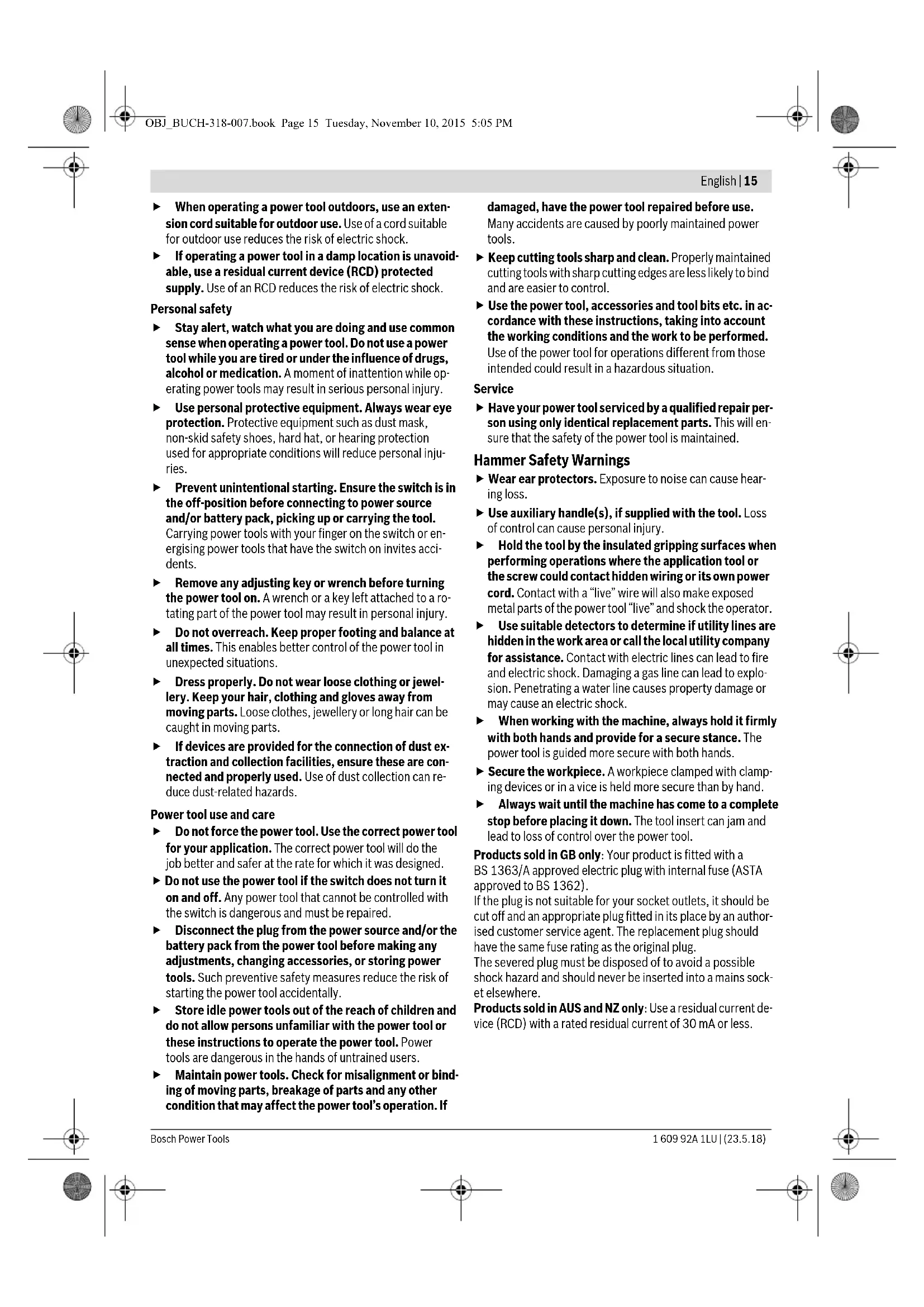 – Hold the rear sleeve 26 of the keyless chuck 23 and turn the front sleeve 25 in anticlockwise direction until until the tool can be inserted. Insert the tool. – Tightly hold the rear sleeve of the keyless chuck 23 and firmly turn the front sleeve clockwise by hand until the locking action is no longer heard. This automatically locks the drill chuck. – Check the tight seating by pulling the tool. OBJ_BUCH-318-007.book Page 18 Tuesday, November 10, 2015 5:05 PMEnglish | 19 Bosch Power Tools 1 609 92A 1LU | (23.5.18) Note: If the tool holder was opened to the stop, then a latching noise possibly may be heard while closing the tool holder and the tool holder will not close. In this case, turn the front sleeve
