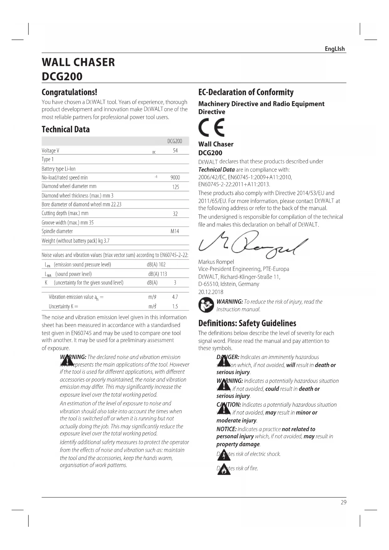 Denotes risk offire. Congratulations! You have chosen a DeWALT tool. Years of experience, thorough product development and innovation make DeWALT one of the most reliable partners for professional power toolusers. Technical Data DCG200 Voltage V