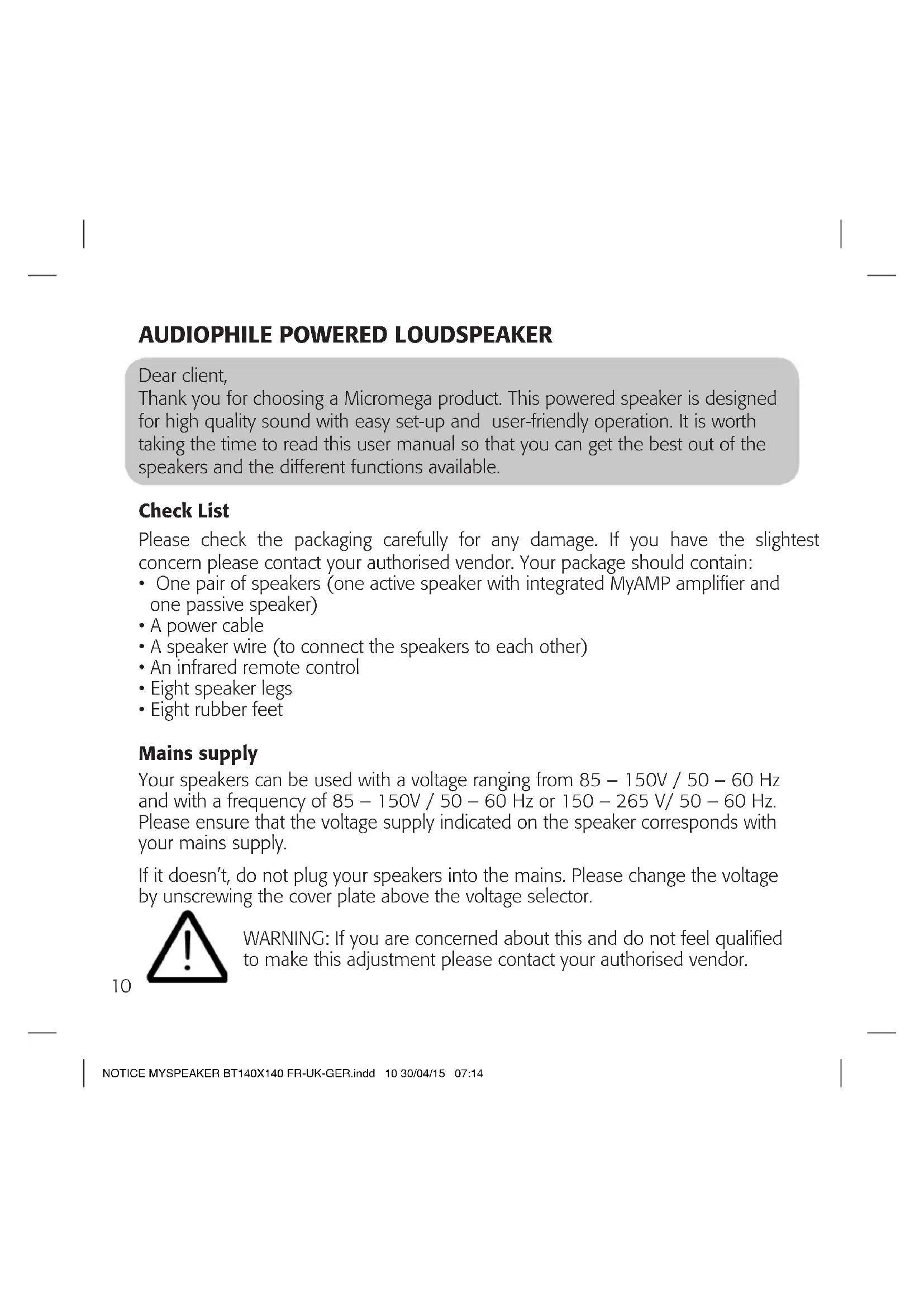 Thank you for choosing a Micromega product. This powered speaker is designed for high quality sound with easy set-up and user-friendly operation. It is worth taking the time to read this user manual so that you can get the best out of the speakers and the different functions available.