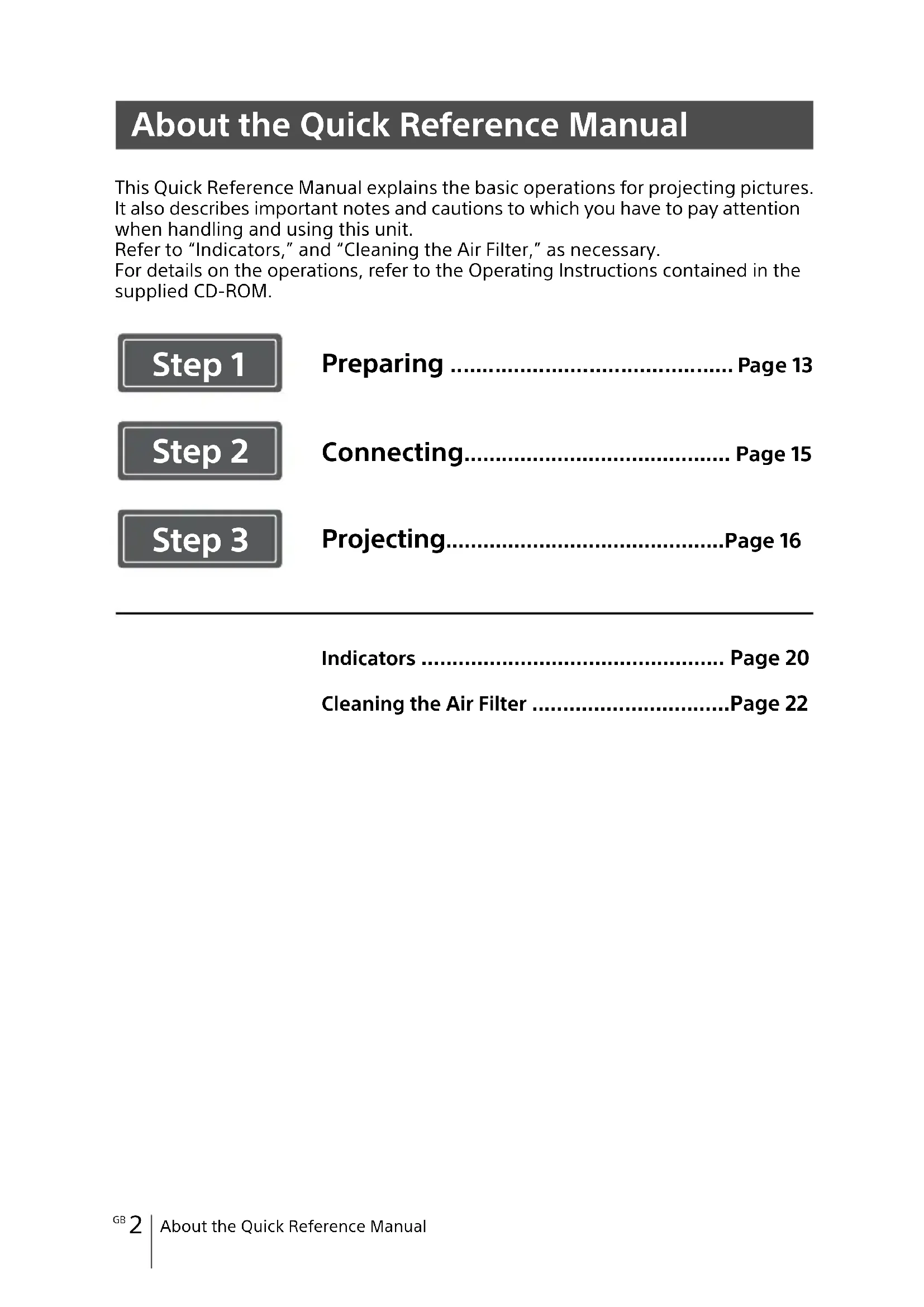 About the Quick Reference ManualThis Quick Reference Manual explains the basic operations for projecting pictures. It also describes important notes and cautions to which you have to pay attention when handling and using this unit.Refer to “Indicators,” and “Cleaning the Air Filter,” as necessary.For details on the operations, refer to the Operating Instructions contained in the supplied CD-ROM. About the Quick Reference Manual Preparing ............................................. Page 13 Connecting........................................... Page 15 Projecting.............................................Page 16 Indicators ................................................. Page 20 Cleaning the Air Filter ................................Page 22 Step 1 Step 2 Step 33