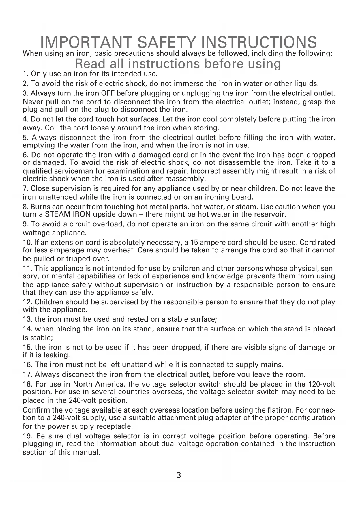 When using an iron, basic precautions should always be followed, including the following: Read all instructions before using