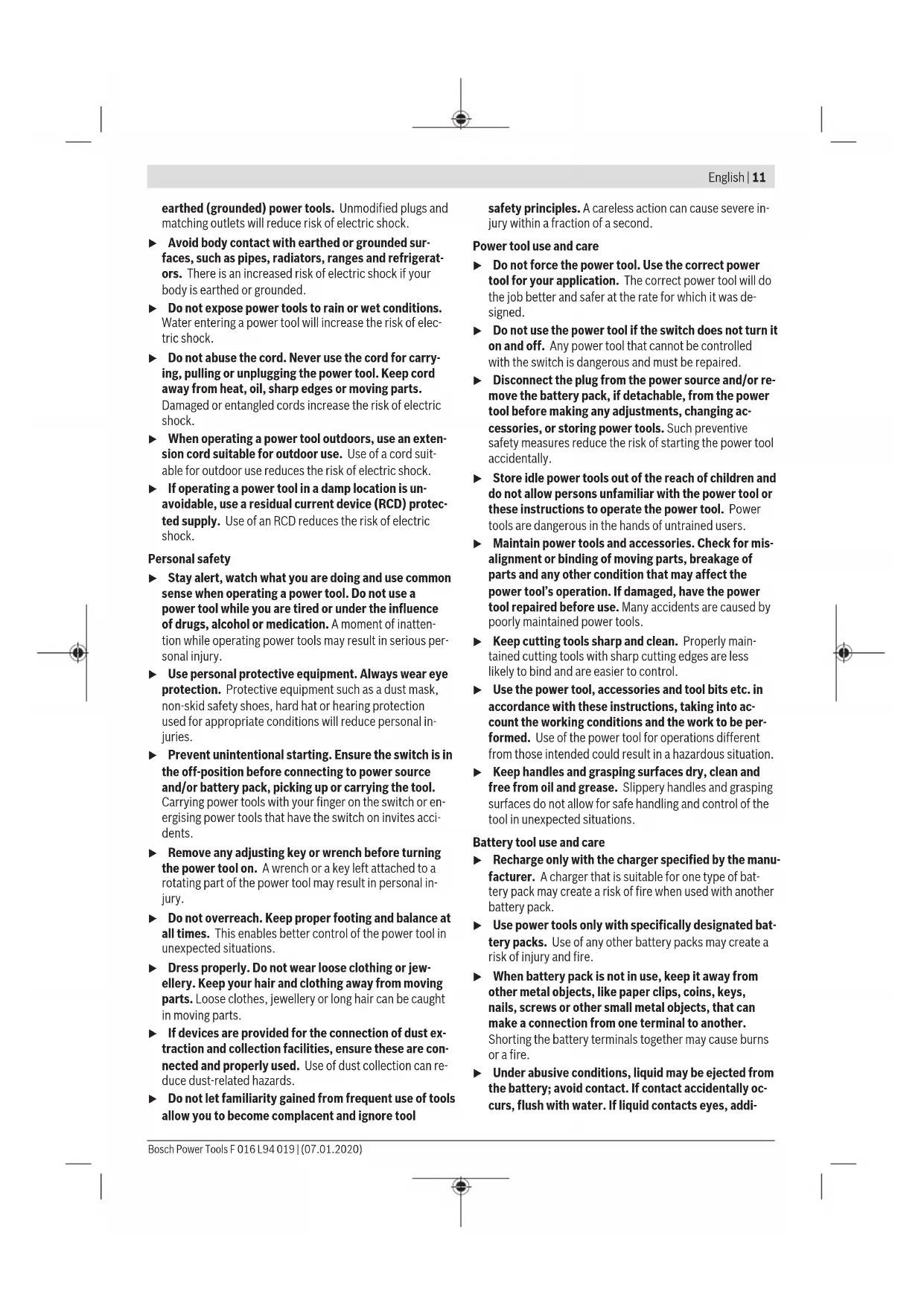 The vibration level and noise emission value given in these instructions have been measured in accordance with a standardised measuring procedure and may be used to com- pare power tools. They may also be used for a preliminary estimation of vibration and noise emissions. The stated vibration level and noise emission value repres- ent the main applications of the power tool. However, if the power tool is used for other applications, with different ap- plication tools or is poorly maintained, the vibration level and noise emission value may differ. This may significantly increase the vibration and noise emissions over the total working period. To estimate vibration and noise emissions accurately, the times when the tool is switched off or when it is running but not actually being used should also be taken into account. This may significantly reduce vibration and noise emissions over the total working period. Implement additional safety measures to protect the oper- ator from the effects of vibration, such as servicing the power tool and application tools, keeping their hands warm, and organising workflows correctly. Starting Operation u Use only the chargers listed in the technical data. Only these battery chargers are matched to the lithium-ion bat- tery of your product. Battery Charging (see figure A) Note: The battery is supplied partially charged. To ensure full capacity of the battery, completely charge the battery before using your tool for the first time. The lithium-ion battery can be charged at any time without reducing its service life. Interrupting the charging procedure does not cause damage to the battery. The Lithium-Ion battery is protected against deep dischar- ging. When the battery is discharged, the tool stops the power-assisted cutting and works in manual mode at all cut- ting diameters. The battery needs to be recharged when the battery charge- control indicator (7) briefly flashes red during a cut. The charge procedure begins as soon as the mains plug of the battery charger is plugged into the socket outlet and the charge Micro USB connector (9) is plugged into Micro USB socket (5) at the handle top. The Micro USB socket (5) can only be accessed when the safety lock (6) is locked. F 016 L94 019 | (07.01.2020) Bosch Power ToolsEnglish | 15 The battery charge-control indicator (7) indicates the char- ging progress. The indicator slowly flashes green during charge process. When the battery charge-control indicator lights up green continuously, the battery is fully charged. During the charging procedure, the handle of the machine warms up. This is normal. Disconnect the battery charger from the mains supply when charging process ends. u Protect the charger from moisture. Observe the notes for disposal. Battery charge-control indicator The battery charge-control indicator (7) indicates the charge condition of the battery while in operation. LED Capacity Continuous lighting, green ≥35% Flashing light, green 5 − 35% Single flash, red 0 − 5% Charging Guide Please charge before use. Charge-control indicator will flash red if: – Charger is damaged – Incorrect charger is installed The tool has overload protection software. If the software is activated, the tool will lock to prevent damage. To reset the protection software, connect the charger. Before re-use, we recommend to fully charge the tool until the charge-control indicator is continuously green. Operation Unlocking (see figure B1) Deactivate the safety lock (6) by pushing it back. The tool will open and is now ready for use. Locking After usage, close the handles and engage the safety lock (6) by pushing it forward. Always keep in locked position, when not in use. Gripping position (see figures B2–B4) Grip the tool at the front, as shown. Do not grip the tool to- wards the back of the handles or with finger(s) between the handles. Power-assisted cutting (see figure B) This tool provides power-assisted cutting. It is operated like a pair of manual secateurs and will cut in manual mode without power-assisted cutting until a certain branch dia- meter is reached. The tool will start power-assisted cutting when cutting above this branch diameter by starting the in- tegrated motor. Noise development while power-assisted cutting is active, is normal. Power-assist feature is only active as long as gripping force is exerted on the handles. If no force is exerted onto the handles, the tool stops. Working Advice Pruning tips (see figures C1–C10) Never operate the tool in an awkward posture. This may cause serious injury. Keep your free hand away from the cutting area. Never touch the blades. They are very sharp and you may cut yourself.