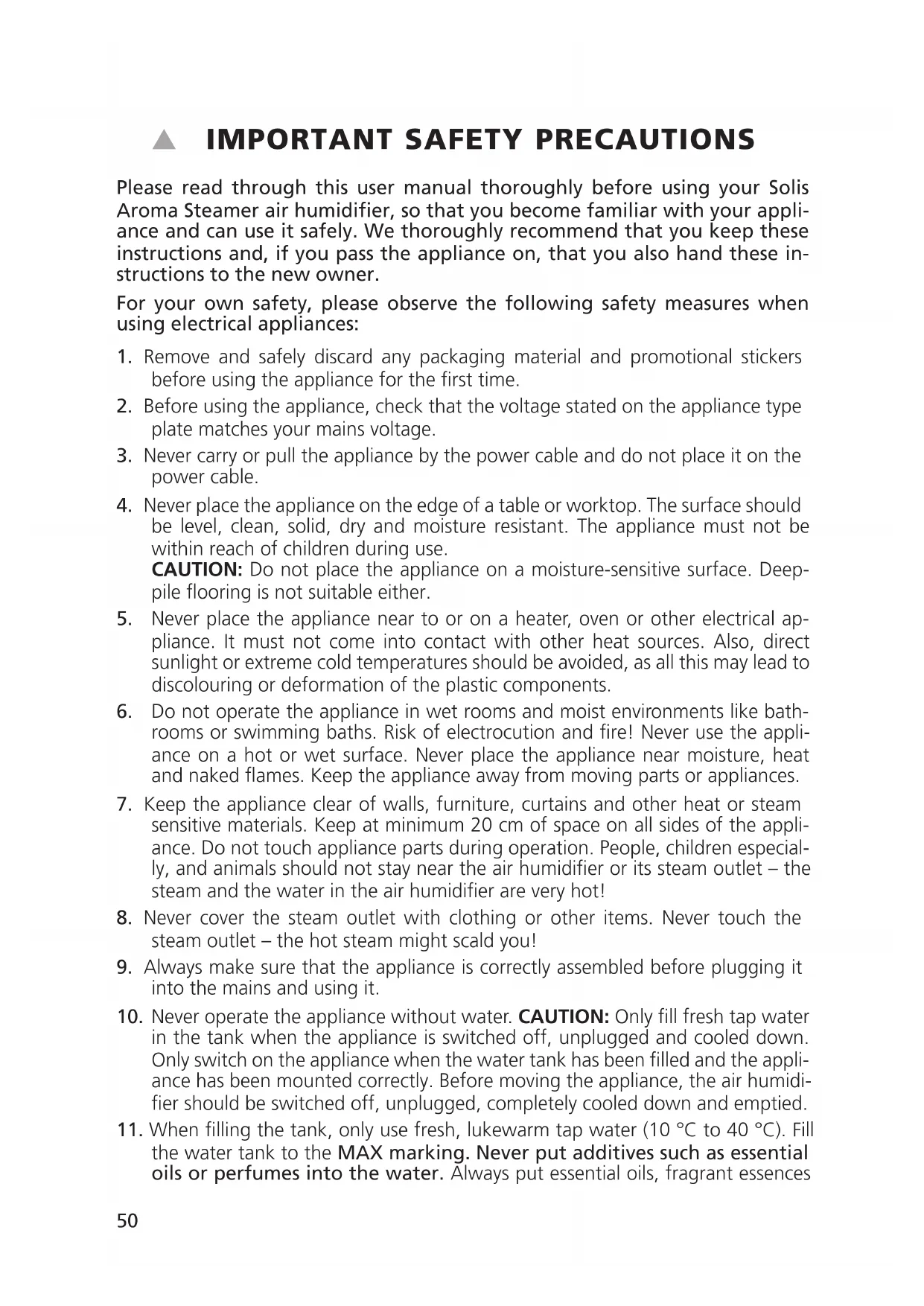 Please read through this user manual thoroughly before using your Solis Aroma Steamer air humidifier, so that you become familiar with your appli- ance and can use it safely. We thoroughly recommend that you keep these instructions and, if you pass the appliance on, that you also hand these in- structions to the new owner. For your own safety, please observe the following safety measures when using electrical appliances: