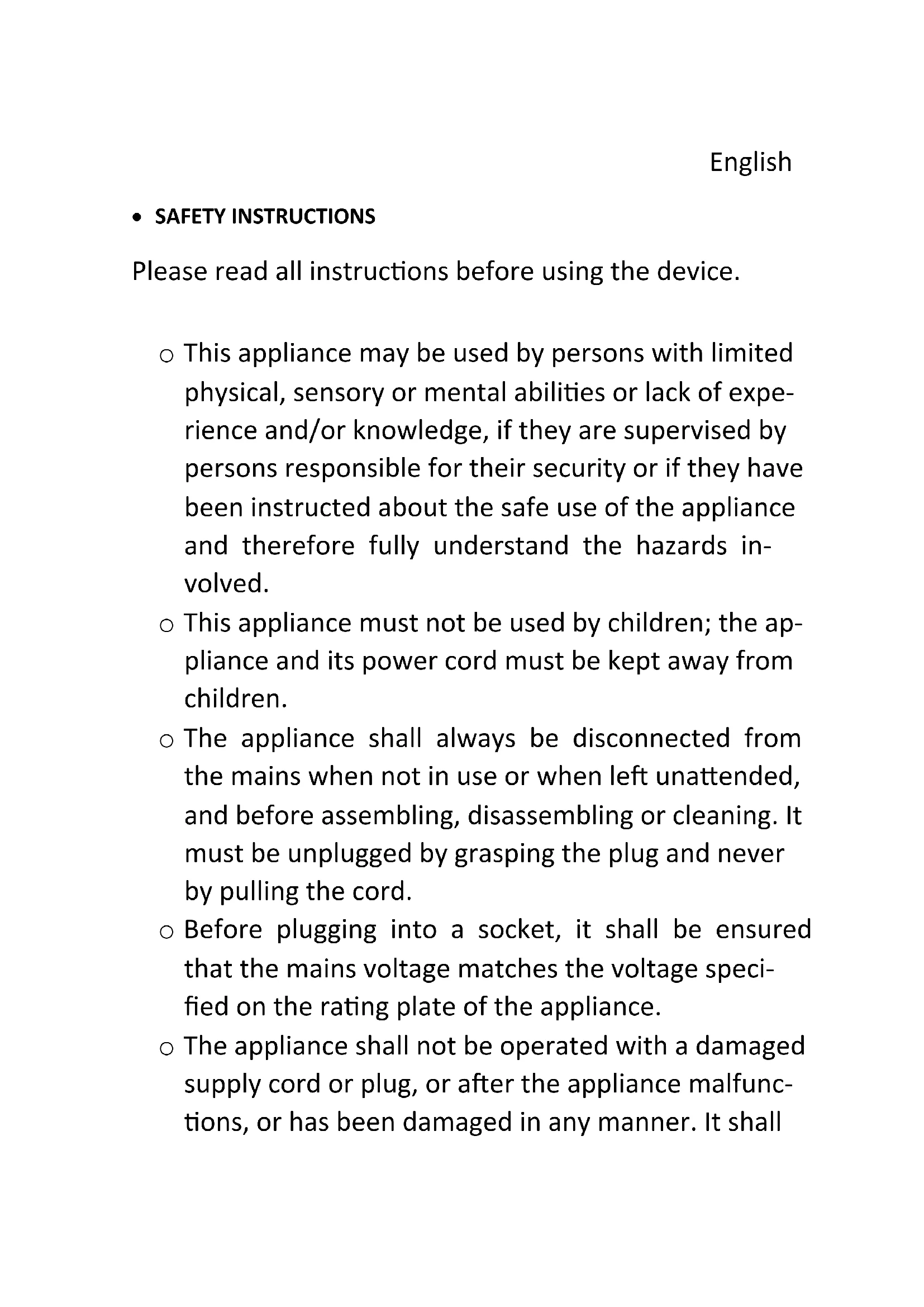 ○ This appliance must not be used by children; the appliance and its power cord must be kept away from children. - The appliance shall always be disconnected from the mains when not in use or when left unattended, and before assembling, disassembling or cleaning. It must be unplugged by grasping the plug and never by pulling the cord.