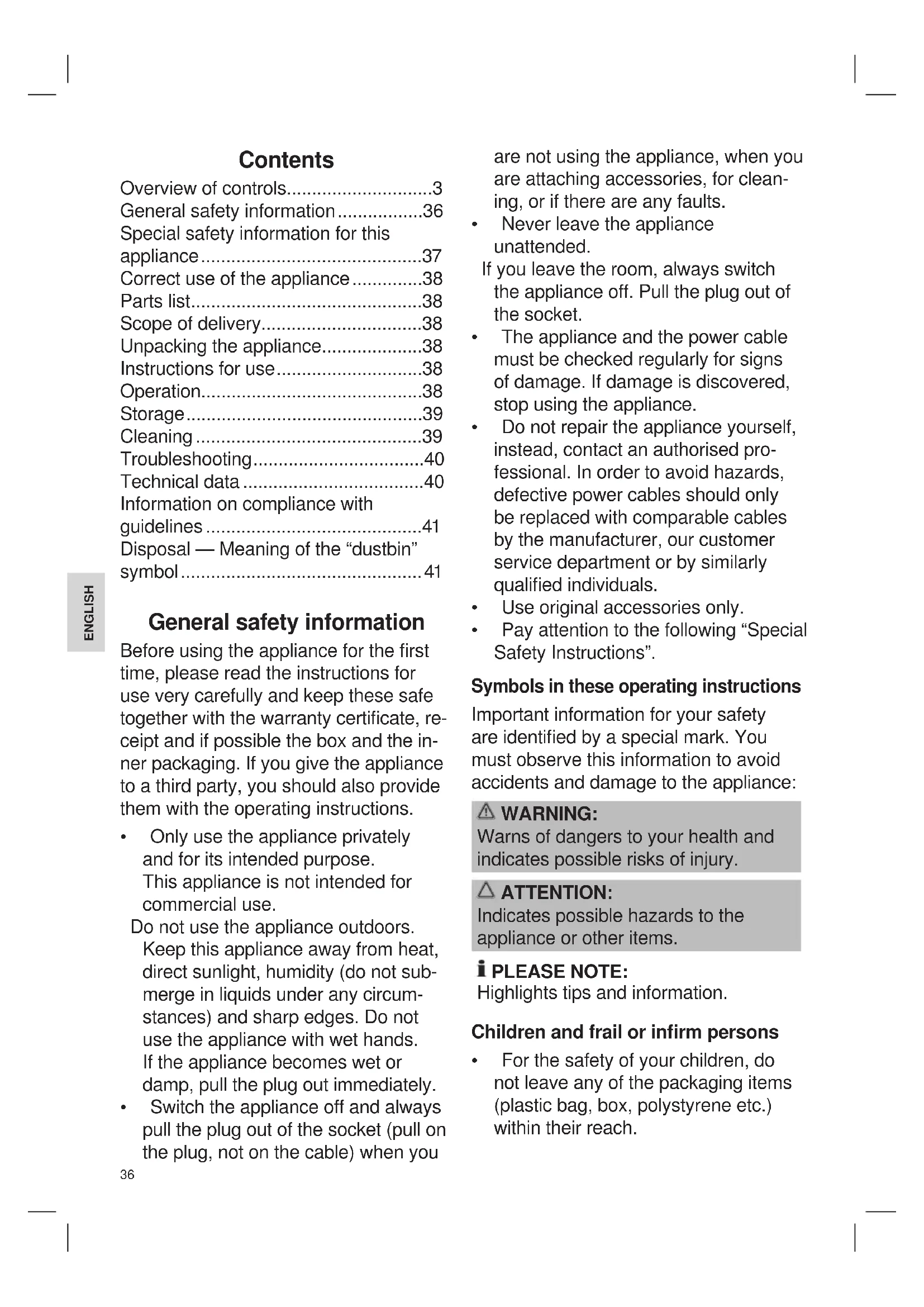 - Payattentiontothefollowing“Special Safety Instructions”. Symbols in these operating instructions Important information for your safety are identified by a special mark. You must observe this information to avoid accidents and damage to the appliance: