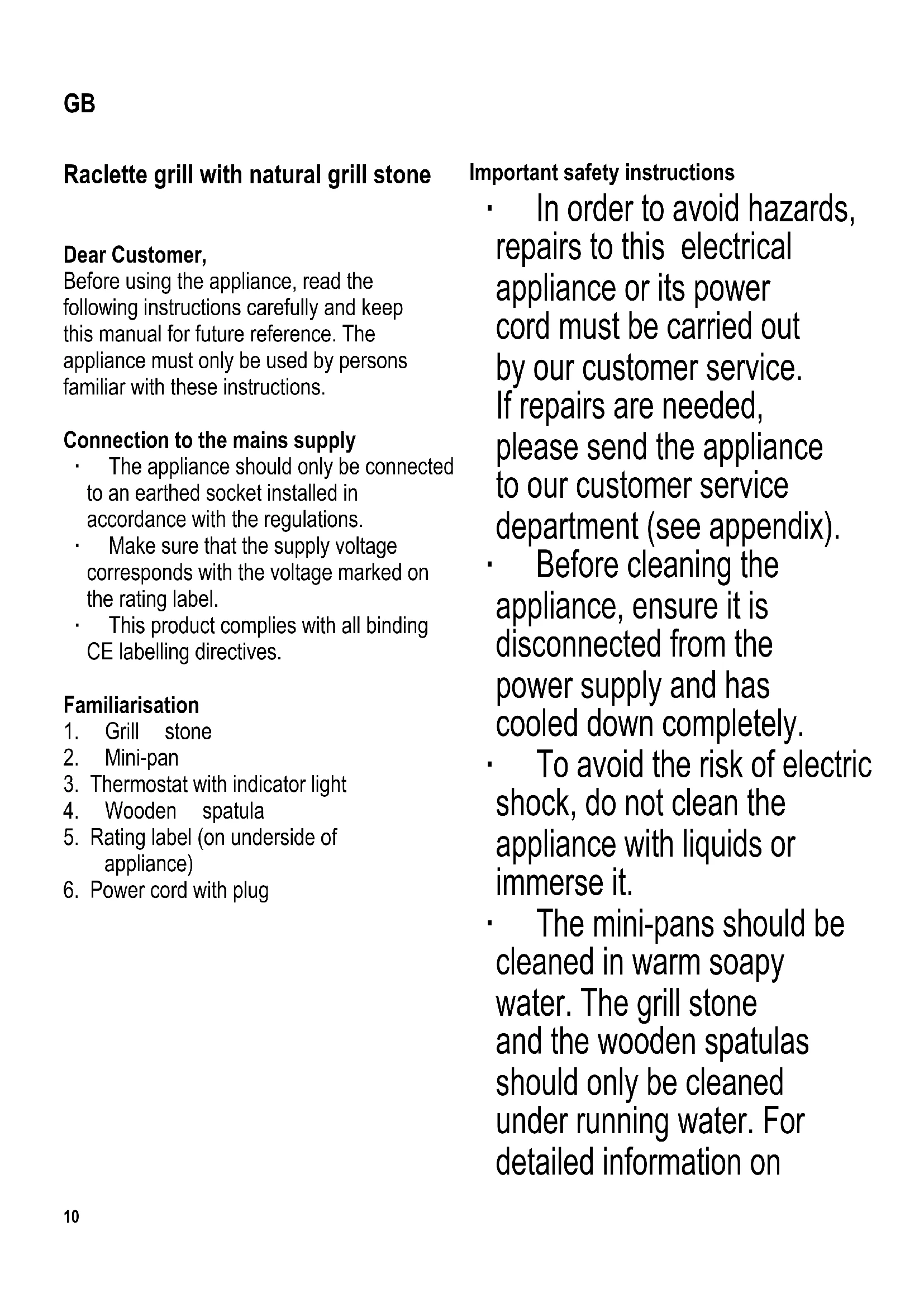 Important safety instructions ∙ In order to avoid hazards, repairs to this electrical appliance or its power cord must be carried out by our customer service. If repairs are needed, please send the appliance to our customer service department (see appendix). ∙ Before cleaning the appliance, ensure it is disconnected from the power supply and has cooled down completely. ∙ To avoid the risk of electric shock, do not clean the appliance with liquids or immerse it. ∙ The mini-pans should be cleaned in warm soapy water. The grill stone and the wooden spatulas should only be cleaned under running water. For detailed information on GB11 cleaning the appliance, please refer to the section Cleaning and care. ∙ The appliance is not intended to be operated by means of an external timer or separate remote-control system. ∙ This appliance is intended for domestic or similar applications, such as - in staff kitchens in shops, offi ces and other similar working environments, - in agricultural working environments, - by customers in hotels, motels etc. and similar accommodation, - in bed-and breakfast type environments. ∙ This appliance may be used by children (at least 8 years of age) and by persons with reduced physical, sensory or mental capabilities, or lacking experience and knowledge, provided they have been given supervision or instruction concerning the use of the appliance and fully understand all dangers and safety precautions involved. ∙ Children must not be permitted to play with the appliance. ∙ Children must not be permitted to carry out any cleaning or maintenance work on the appliance unless they are supervised and at least 8 years of age. ∙ The appliance and its power cord must be kept well away from children under 8 at all times. ∙ Caution: Keep children away from any packaging materials– these are a potential source of danger, e.g. of suffocation. ∙ Every time the appliance is used, the main body including the power cord as12 well as any attachment fi tted should be checked thoroughly for any defects. Should the appliance, for instance, have been dropped onto a hard surface, or if excessive force has been used to pull the power cord, it must no longer be used: even invisible damage may have adverse effects on the operational safety of the appliance. ∙ The surfaces of the appliance, grill stone and mini-pans become hot during use. Caution: There is a danger of burns. ∙ Do not leave the appliance unattended while in use. ∙ Do not allow the power cord to touch any hot part of the appliance. ∙ During operation, the appliance must be placed on a heat-resistant, stable and level surface, impervious to splashes and stains. When cooking food with a high fat or moisture content, splashes are not always avoidable. ∙ Do not position the grill next to a wall or corner, and ensure that no infl ammable materials are stored near it. ∙ Do not position the appliance on or near hot surfaces, open fl ames or infl ammable vapours. ∙ Caution: Do not operate the appliance outdoors. ∙ Before use, the grill stone must be placed on top of the appliance over the heating element. ∙ Always remove the plug from the wall socket - after use, - in case of any malfunction, and - before cleaning the appliance. ∙ When removing the plug from the wall socket, never pull on the power cord; always grip the plug itself. ∙ Caution: This appliance should only be used with the attachments provided by the manufacturer. ∙ Always allow suffi cient time for the appliance to cool down before removing the grill stone, and before cleaning or storing the unit. ∙ No responsibility will be accepted if damage results from improper use, or if these instructions are not complied with. Applications This appliance is an electric raclette grill, suitable for low-fat grilling of meat, fi sh and vegetables and for cheese ‘au gratin’. Any use other than that described in these instructions must be considered improper and may lead to personal injury or material damage. Before fi rst use ∙ Remove any packing materials completely. ∙ Before using the grill for the fi rst time, clean the grill stone, the wooden spatulas and mini-pans with a damp cloth. ∙ Heat up the appliance with the stone and mini-pans for about 10 minutes, without any food, to eliminate the smell typically encountered when fi rst switching on a grill (a small amount of smoke may be noticeable). For that reason, adequate ventilation should be ensured by opening windows or balcony doors. ∙ Allow the appliance to cool down, and then clean it as described in Cleaning and care.13 Grill stone ∙ Before use, fi t the stone on the appliance with the smooth side facing up. Caution: Avoid placing a cold stone onto a hot element. ∙ The stone can be used for cooking vegetables, sliced meat or fi sh etc. as required. ∙ This stone is entirely natural material. Small cracks resulting from natural expansion and contraction during heating and cooling, as well as a change to a darker colour are normal and have no detrimental effects. ∙ Do not place any frozen food or items containing vinegar (such as pickled gherkins or mustard) on the stone. Variable thermostat and indicator light ∙ If the thermostat control is set all the way to the right, the heating element remains on. But if the thermostat is moved to the left, the element will switch off and on alternately. ∙ The red indicator light remains lit as long as the heating element is on. ∙ After use, return the thermostat to its lowest setting and unplug the appliance from the mains supply. Operation Hint: For the very best results, meat should be taken from the refrigerator about half an hour before grilling, covered and left to stand. ∙ Place the stone on the appliance with the smooth side facing up. ∙ Insert the plug into a suitable wall socket and turn the thermostat all the way to the right. ∙ Let the appliance preheat for about 25 minutes to reach the required 