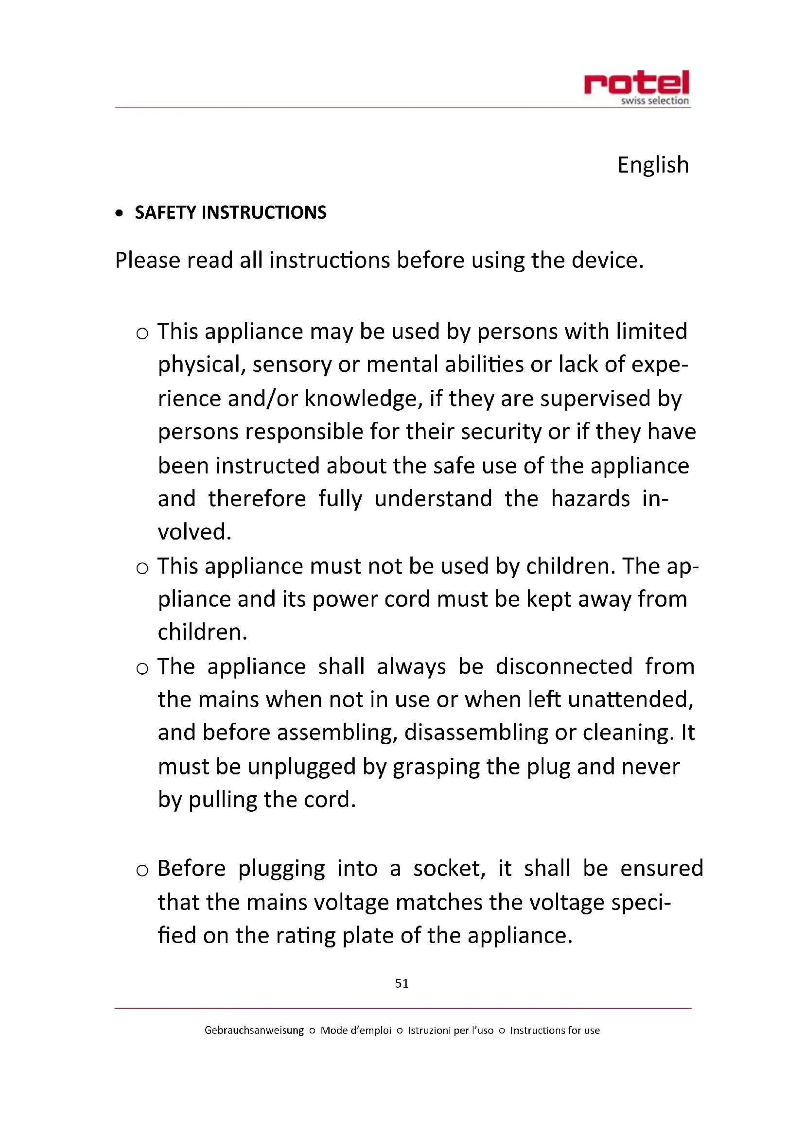 ○ This appliance may be used by persons with limited physical, sensory or mental abilities or lack of experience and/or knowledge, if they are supervised by persons responsible for their security or if they have been instructed about the safe use of the appliance and therefore fully understand the hazards involved.