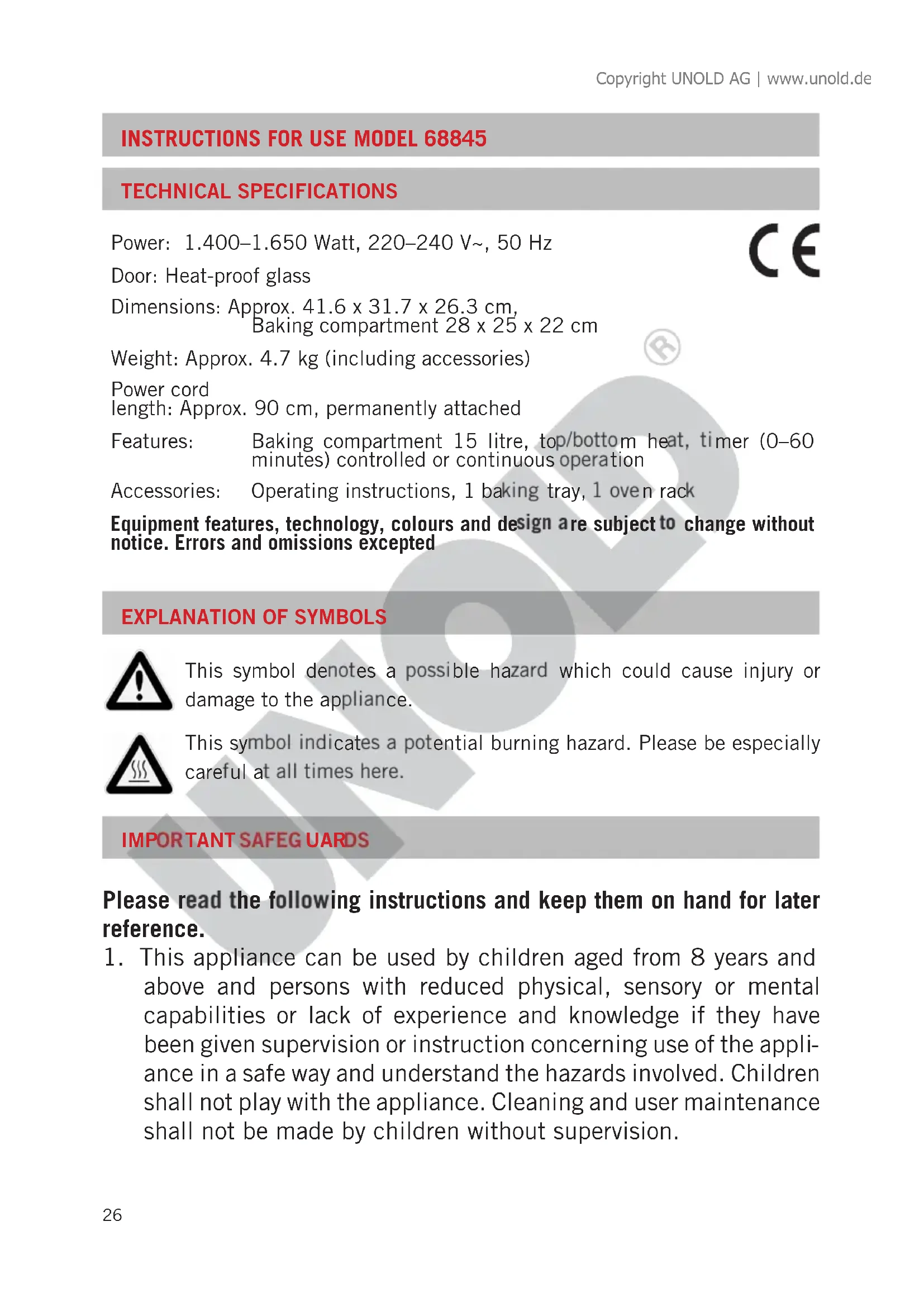 Our appliances are produced on a high quality level for a long lifetime. Regular maintenance and expert repairs by our after-sales service can extend the useful life of the appliance. If an appliance is defective and repair is not possible we ask you to follow the following instructions for disposal. Do not dispose this appliance together with your standard household waste. Please bring this product to an approved collection point for recycling of electric and electronic products. By separate collection and disposal of waste products you help to protect natural resources and ensure, that the product is disposed in an adequate way to protect health and environment. We grant a 24 months guarantee, and in case of commercial use a 12 months guarantee, starting from the date of purchase for any damage demonstrably due to manufacturing defects and when the appliance has been used according to its intended use. Within the warranty period we will remedy defective materials or workmanship through repair or replacement, at our option. Our warranty terms apply only to appliances sold in Germany and Austria. For other countries, please contact the re- sponsible importer. In the event of a claim for remedy of defects, please send the appliance to our after sales service, properly packaged and postage paid, together with a copy of the automatically generated sales receipt, which must show the date of purchase, and a description of the defect. If the defect is covered by the warranty, the customer will be reimbursed for the shipping costs only in Germany and Austria. The warranty does not cover damage from normal wear, improper handling and failure to comply with the maintenance and care instructions. The warranty is void if repairs or modifications are made to the appliance by third parties. Any claims of the end consumer vis-à-vis the retailer are not limited by this warranty. The instruction booklet is also available for download: www.unold.de GUARANTEE CONDITIONS Copyright UNOLD AG | www.unold.de38 Puissance : 1.300 Watt, 220–240 V~, 50 Hz Porte : Verre résistant à la chaleur Dimension : Env., 41,6 x 31,7 x 26,3 cm, espace de cuisson 28 x 25 x 22 cm Poids : Env. 7,5 kg (y compris les accessoires) Longueur du cordon : Env. 90 cm, monté à demeure Équipement : Espace de cuisson 15 litres, chaleur par le haut et par le bas, minuterie réglable de 0 – 60 minutes ou fonctionnement en continu Accessoires : Notice d’utilisation, 1 feuille de cuisson, 1 grille de cuisson Modifications et erreurs des caractéristiques de l‘équipement, de la technique, des couleurs et du design réservées