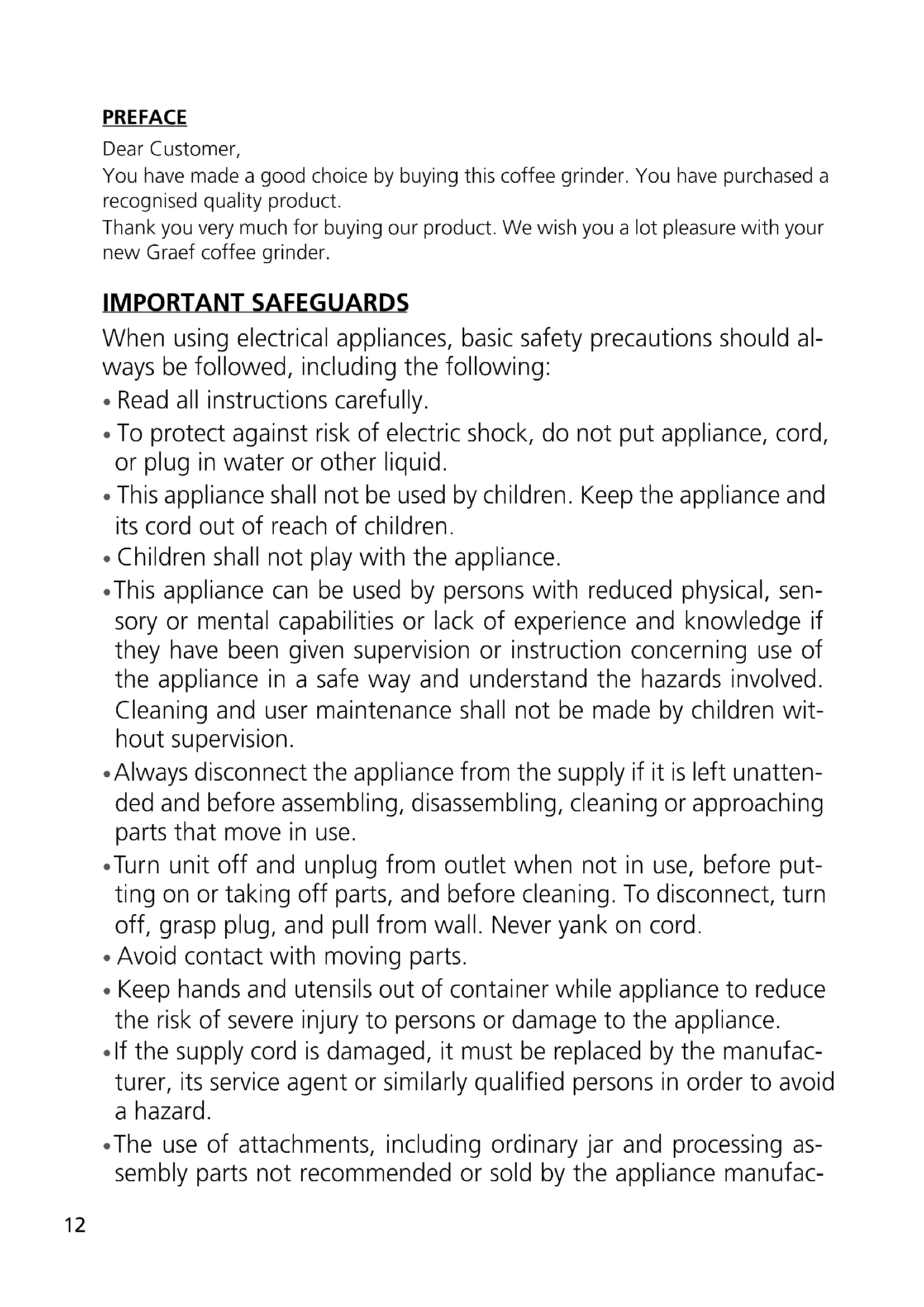 PRODUCT DESCRIPTION Motor Base Coffee Ground cup Timer & Start / Stop Lid Spoon Bean Container Lid12 PREFACE Dear Customer, You have made a good choice by buying this coffee grinder. You have purchased a recognised quality product. Thank you very much for buying our product. We wish you a lot pleasure with your new Graef coffee grinder. IMPORTANT SAFEGUARDS When using electrical appliances, basic safety precautions should al- ways be followed, including the following: