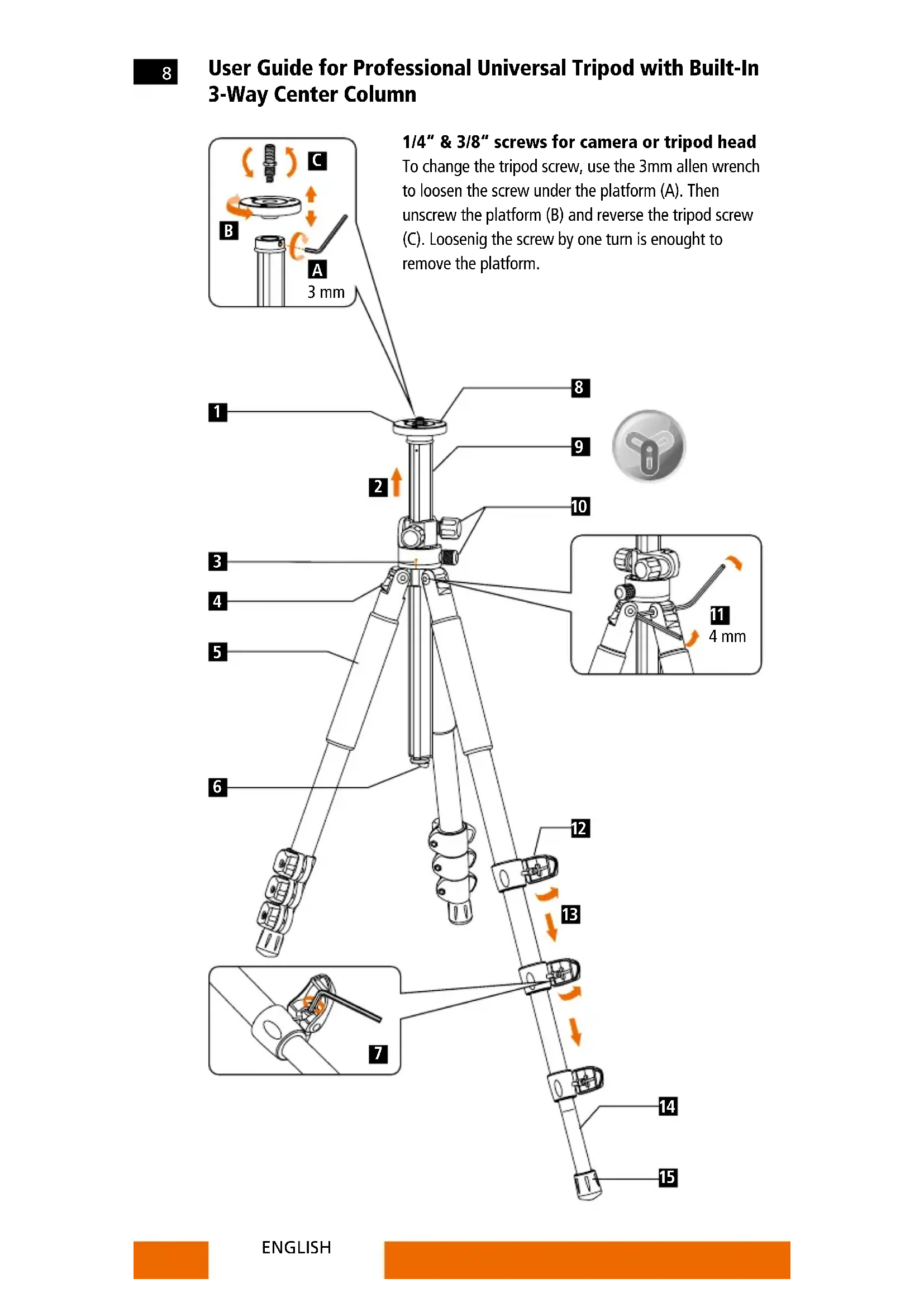 1/4“ & 3/8“ screws for camera or tripod head To change the tripod screw, use the 3mm allen wrench to loosen the screw under the platform (A). Then unscrew the platform (B) and reverse the tripod screw (C). Loosenig the screw by one turn is enought to remove the platform. User Guide for Professional Universal Tripod with Built-In 3-Way Center Column ENGLISH9