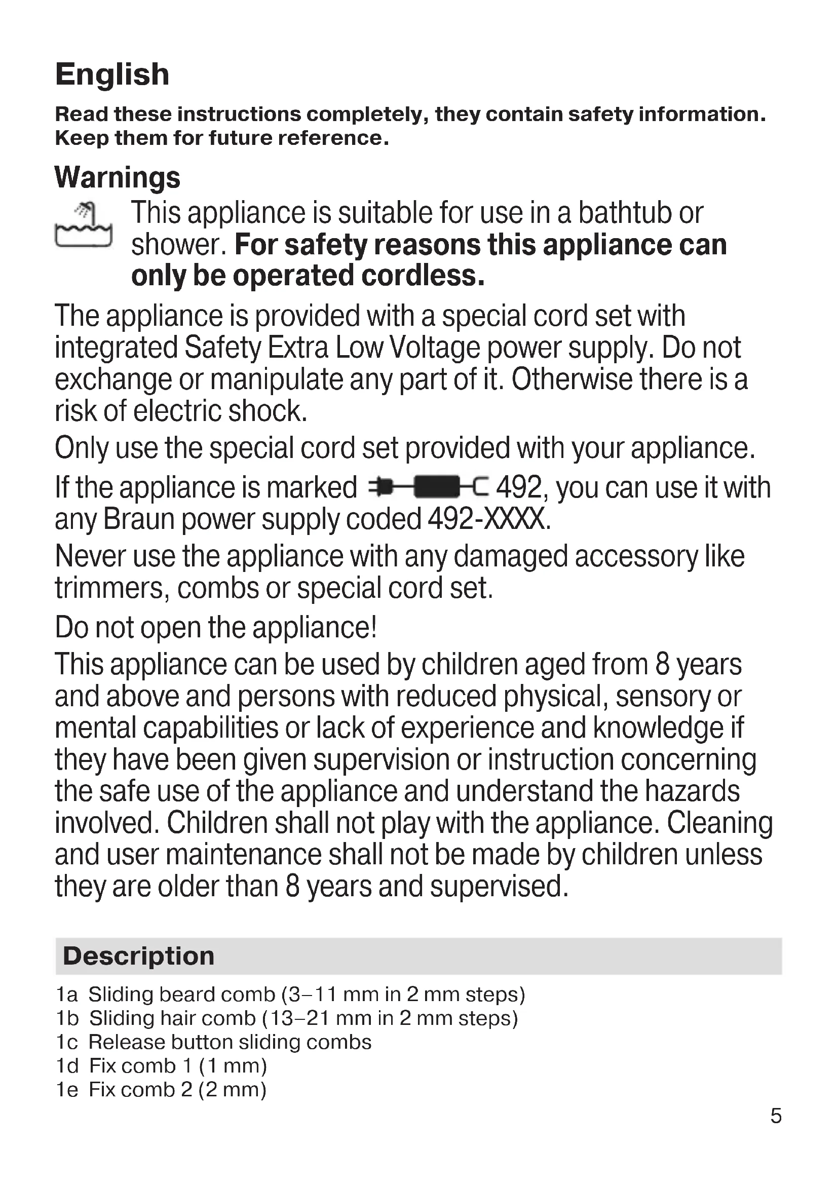 91973553_MGK7021_7020_7920_MGK5080_CEEMEA.indd 391973553_MGK7021_7020_7920_MGK5080_CEEMEA.indd 3 17.08.18 09:0517.08.18 09:05 Business Use - P&G AUTHORIZED POA-00067294 Rev 001 Effective Date 2018-08-20 Printed 2019-02-27 Page 3 of 804 91973553_MGK7021_7020_7920_MGK5080_CEEMEA.indd 491973553_MGK7021_7020_7920_MGK5080_CEEMEA.indd 4 17.08.18 09:0517.08.18 09:05 Business Use - P&G AUTHORIZED POA-00067294 Rev 001 Effective Date 2018-08-20 Printed 2019-02-27 Page 4 of 805 English Read these instructions completely, they contain safety information. Keep them for future reference. Warnings This appliance is suitable for use in a bathtub or shower. For safety reasons this appliance can only be operated cordless. The appliance is provided with a special cord set with integrated Safety Extra Low Voltage power supply. Do not exchange or manipulate any part of it. Otherwise there is a risk of electric shock. Only use the special cord set provided with your appliance. If the appliance is marked 492, you can use it with any Braun power supply coded 492-XXXX. Never use the appliance with any damaged accessory like trimmers, combs or special cord set. Do not open the appliance! This appliance can be used by children aged from 8 years and above and persons with reduced physical, sensory or mental capabilities or lack of experience and knowledge if they have been given supervision or instruction concerning the safe use of the appliance and understand the hazards involved. Children shall not play with the appliance. Cleaning and user maintenance shall not be made by children unless they are older than 8 years and supervised. Description 1a Sliding beard comb (3–11 mm in 2 mm steps) 1b Sliding hair comb (13–21 mm in 2 mm steps) 1c Release button sliding combs 1d Fix comb 1 (1 mm) 1e Fix comb 2 (2 mm) 91973553_MGK7021_7020_7920_MGK5080_CEEMEA.indd 591973553_MGK7021_7020_7920_MGK5080_CEEMEA.indd 5 17.08.18 09:0517.08.18 09:05 Business Use - P&G AUTHORIZED POA-00067294 Rev 001 Effective Date 2018-08-20 Printed 2019-02-27 Page 5 of 806 2a Trimmer head 2b Ear & nose trimmer head* 2c Detailed trimmer head* 2d Body groomer head* 2e Mini foil shaver head* 3 On/off button 4 Charging indicator 5 Power socket 6 Special cord set (design can differ) 7 Charging stand*