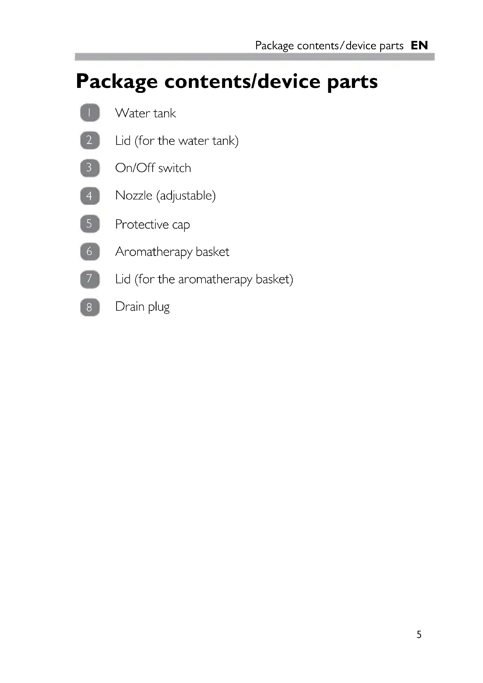 3. Empty and clean the water tank 1 and the aromatherapy basket 6 after every use.