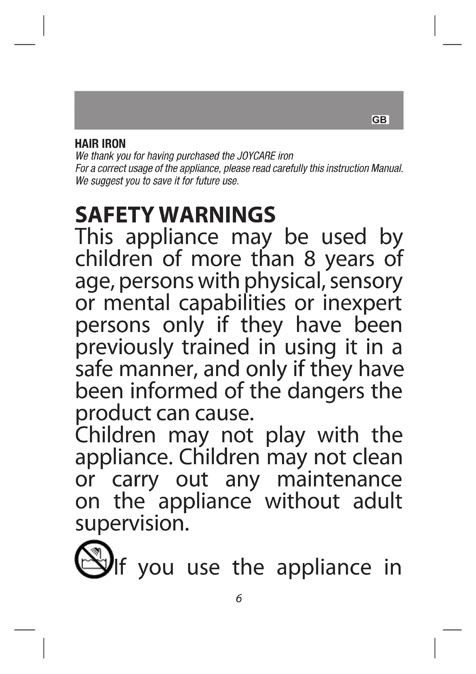HAIR IRON We thank you for having purchased the JOYCARE iron For a correct usage of the appliance, please read carefully this instruction Manual. We suggest you to save it for future use. SAFETY WARNINGS This appliance may be used by children of more than 8 years of age, persons with physical, sensory or mental capabilities or inexpert persons only if they have been previously trained in using it in a safe manner, and only if they have been informed of the dangers the product can cause. Children may not play with the appliance. Children may not clean or carry out any maintenance on the appliance without adult supervision. If you use the appliance in7 a bathroom, pull the plug out of the socket after use, because the presence of water is dangerous even when the appliance is switched o.